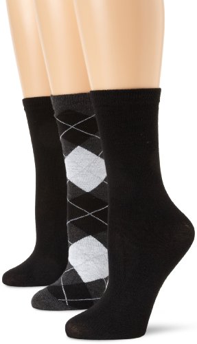 Anne Klein Women's 3 Pair Pack Argyle Crew Socks, Charcoal/Black/Black, One Size