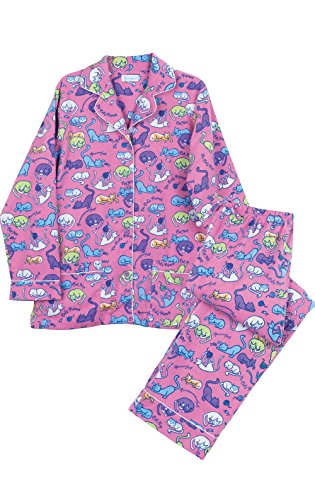 PajamaGram Women's Cat Nap Flannel Pajamas with Button-Up Top, Pink, LRG (12-14)