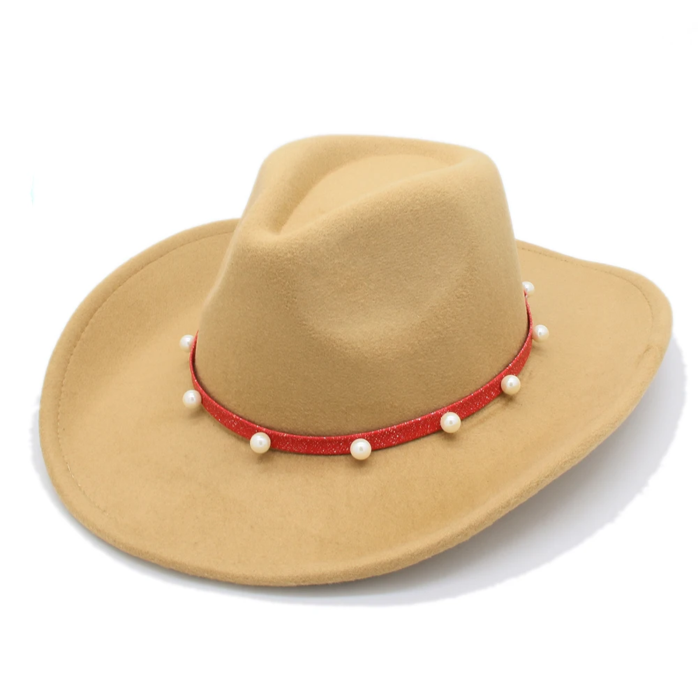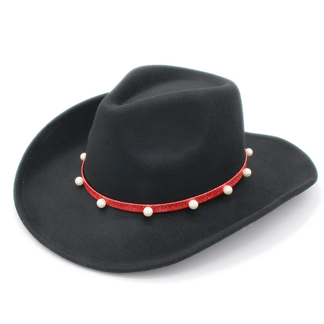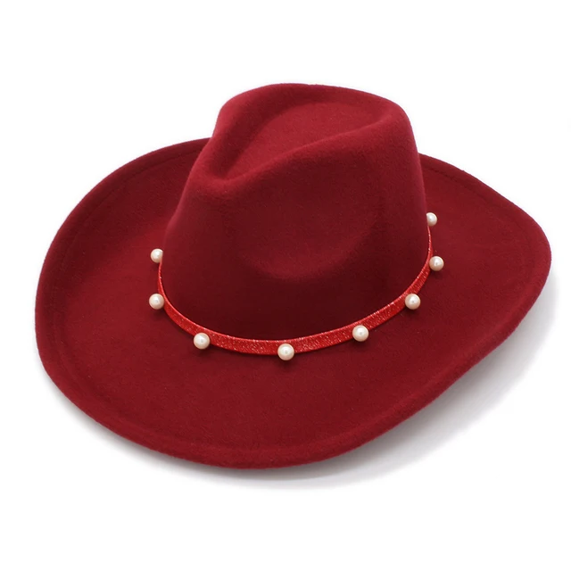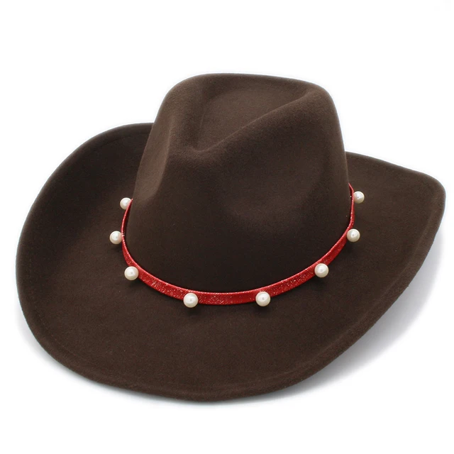| [해외]INFINITLOVE 남녀 멋진 조절 스트랩 울 빈티지 진주 레드 가죽 리본 Hondo 크라운 Anallergisch 카우보이 서양 모자 |