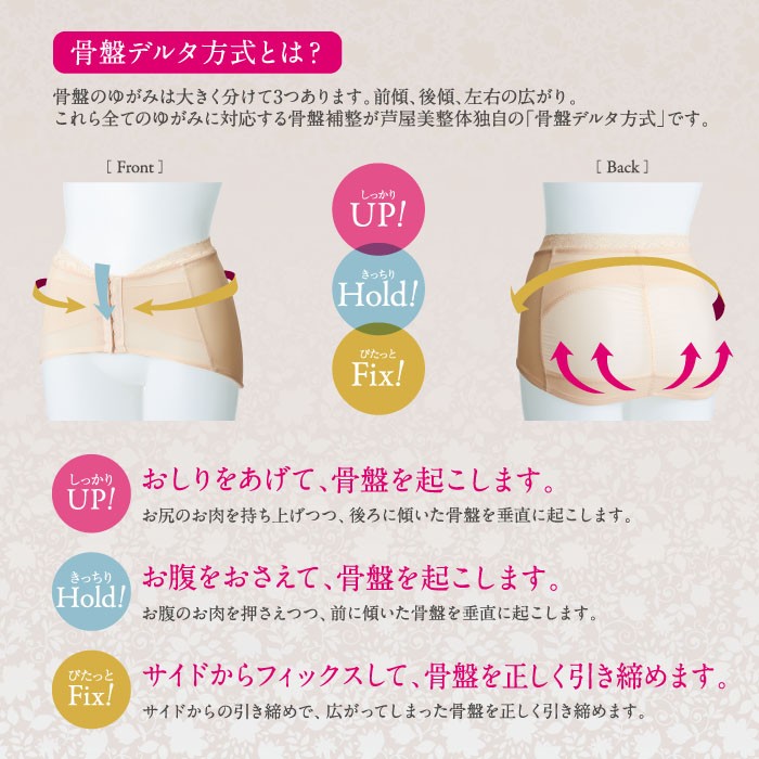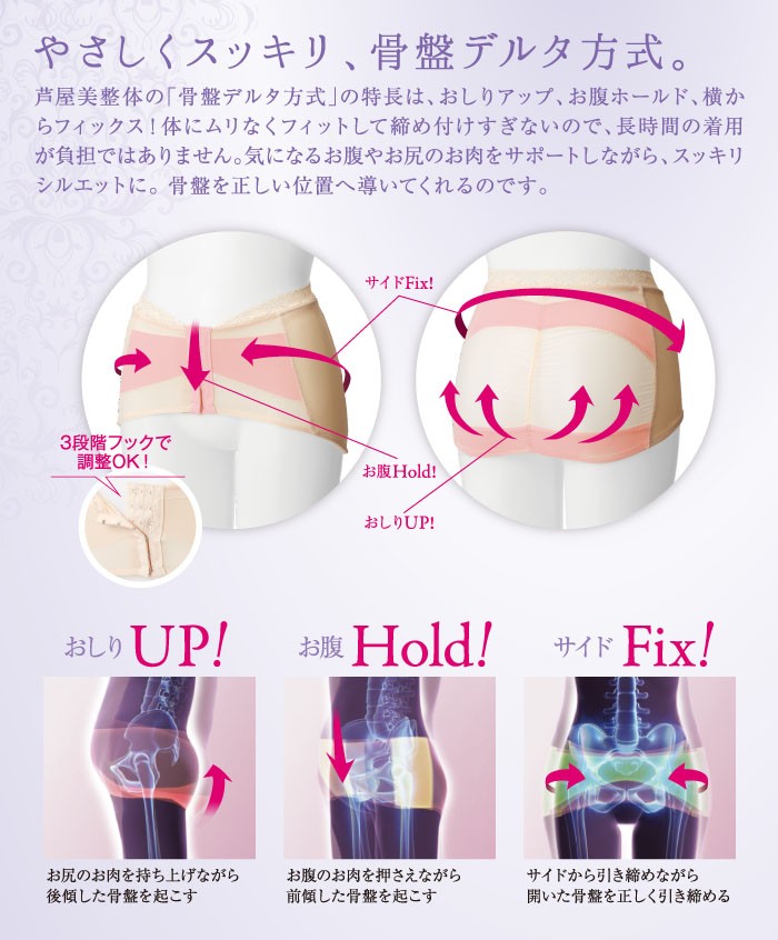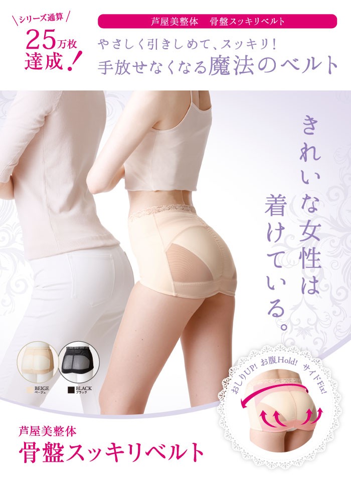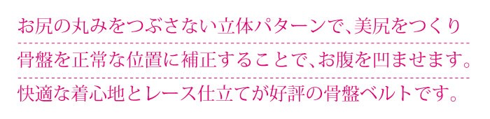 お尻の丸みをつぶさない立体パターンで、美尻ををつくり骨盤を正常な位置に補正することで、お腹を凹ませます。快適な着心地をレース仕立てが好評の骨盤ベルトです。