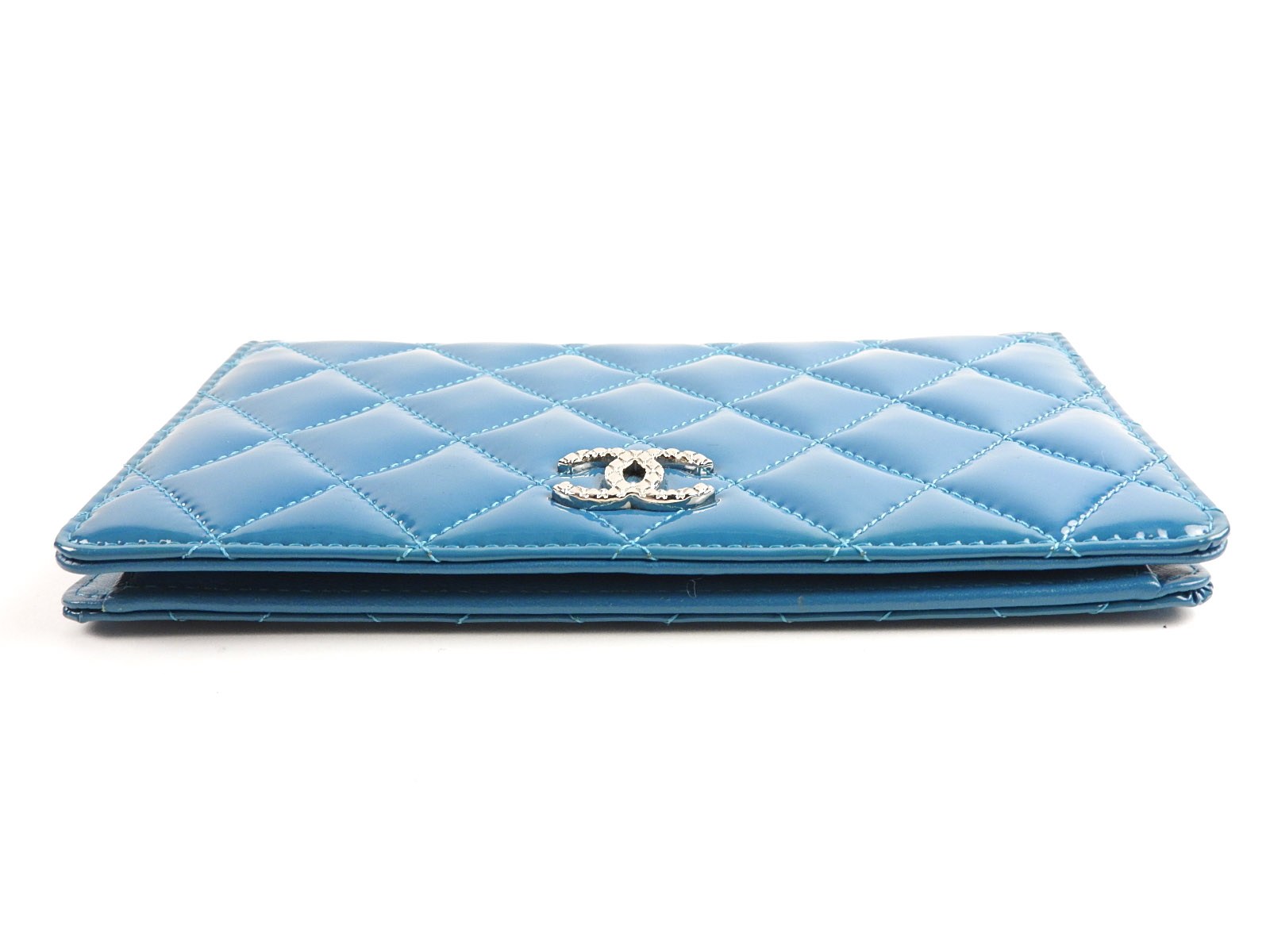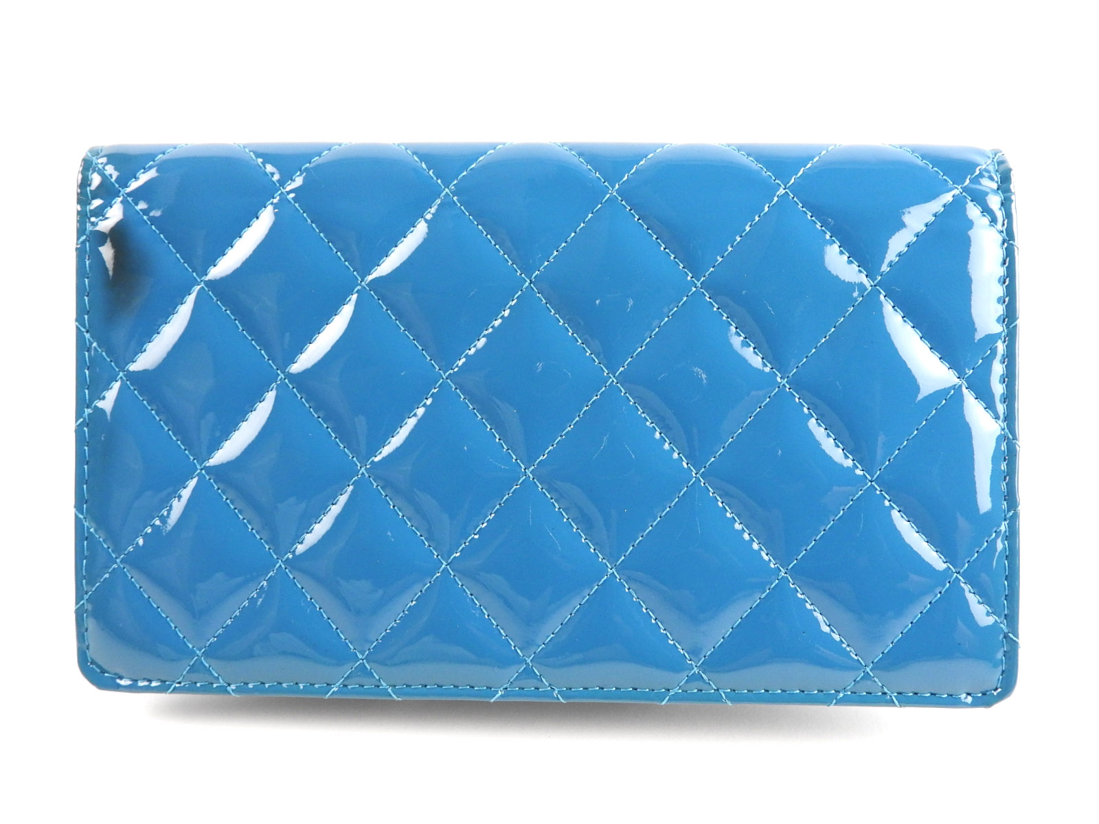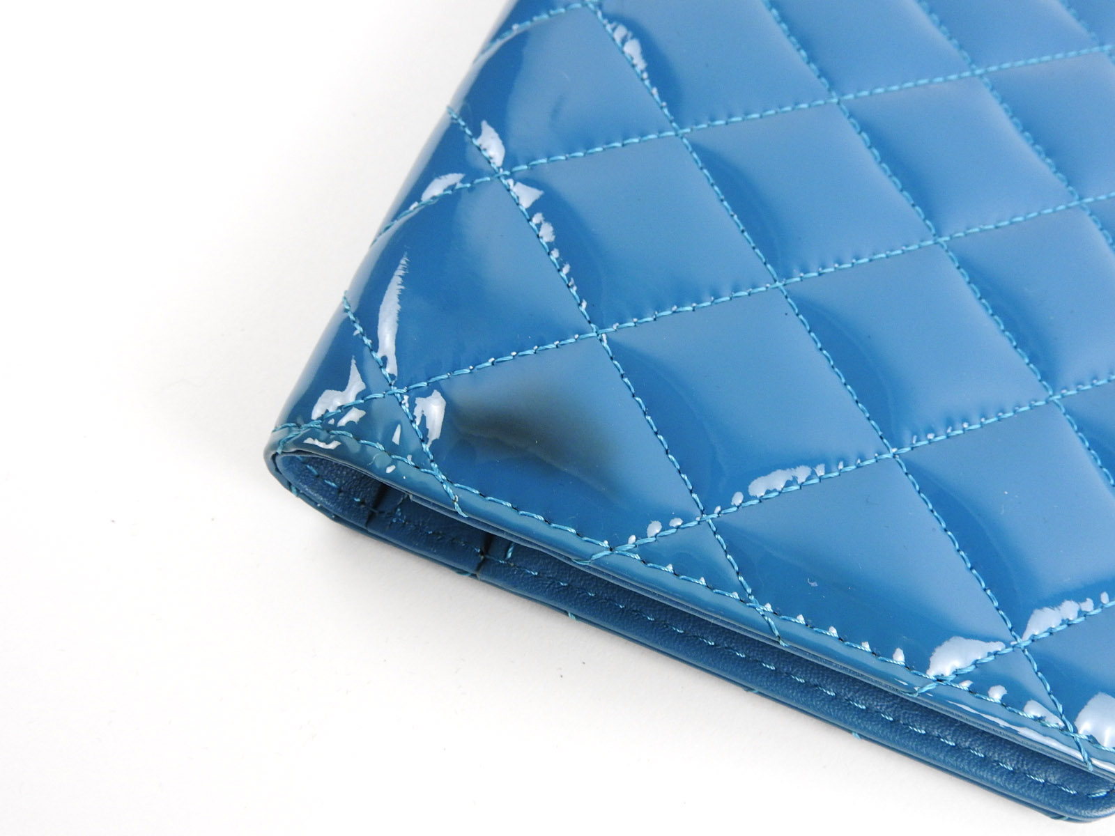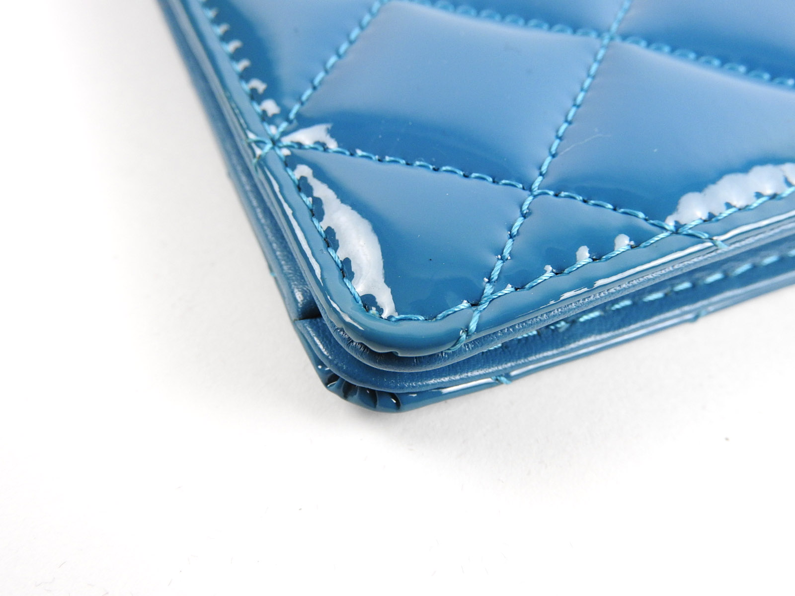 Auth CHANEL CC Brilliant Matelasse Bifold Long Wallet Enamel Patent Leather Blue Silver A48691 A-7527