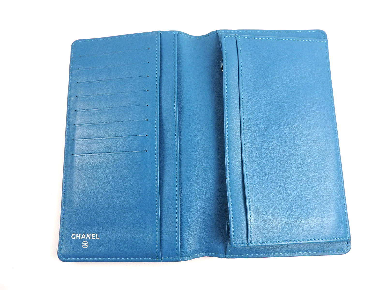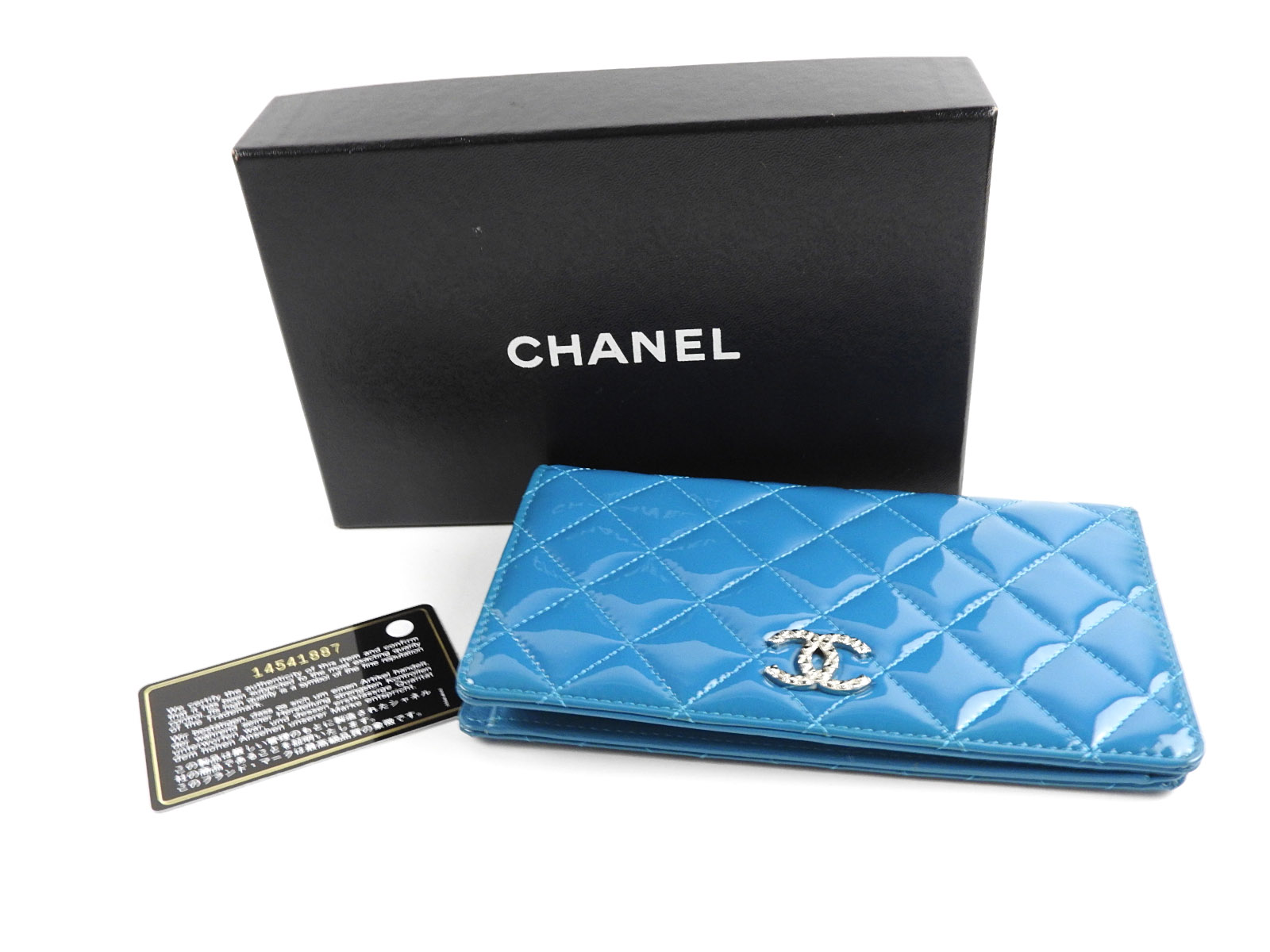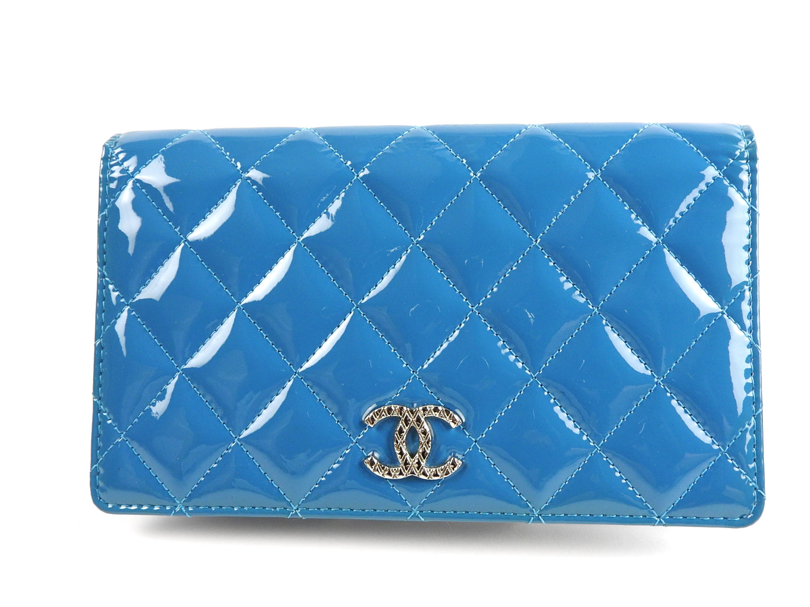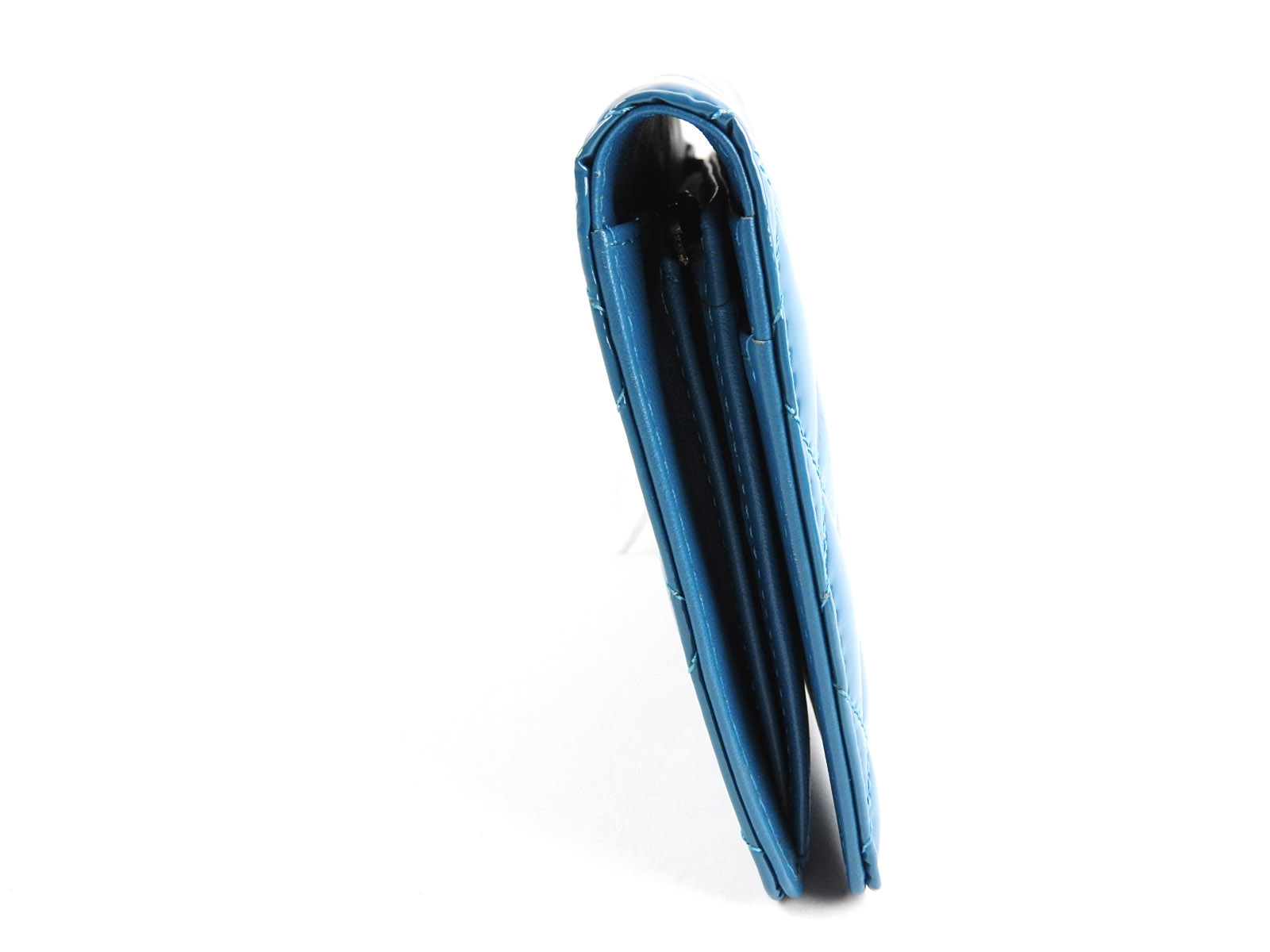 Auth CHANEL CC Brilliant Matelasse Bifold Long Wallet Enamel Patent Leather Blue Silver A48691 A-7527