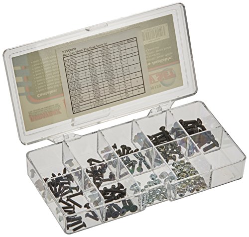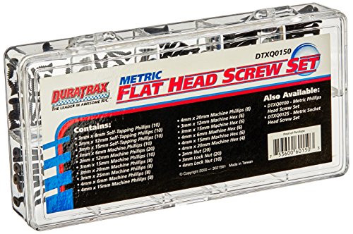 boat and heli modelers Includes a compact ten compartment clear plastic storage case Screws for each compartment are bagged for easy handling and identification. 138 assorted metric flat head screws with either a phillips drive or hexagon socket drive. All hardware is metal;INCLUDES: (10) 3 x 8mm Self-Tapping Phillips (10) 3 x 12mm Self-Tapping Phillips (10) 3 x 15mm Self-Tapping Phillips (10) 3 x 6mm Machine Phillips (6) 3 x 12mm Machine Hex (20) 3 x 12mm Machine Phillips (6) 3 x 15mm Machine Hex (10) 3 x 15mm Machine Phillips (6) 4 x 6mm Machine Hex (8) 3 x 20mm Machine Phillips (6) 4 x 15mm Machine Hex (8) 3 x 25mm Machine Phillips (4) 4 x 20mm Machine Hex (8) 4 x 6mm Machine Phillips (20) 3mm nut (8) 4 x 15mm Machine Phillips (20) 3mm Lock Nut (8) 4 x 20mm Machine Phillips (10) 4mm Lock Nut;Metric Flat Head Screw Set