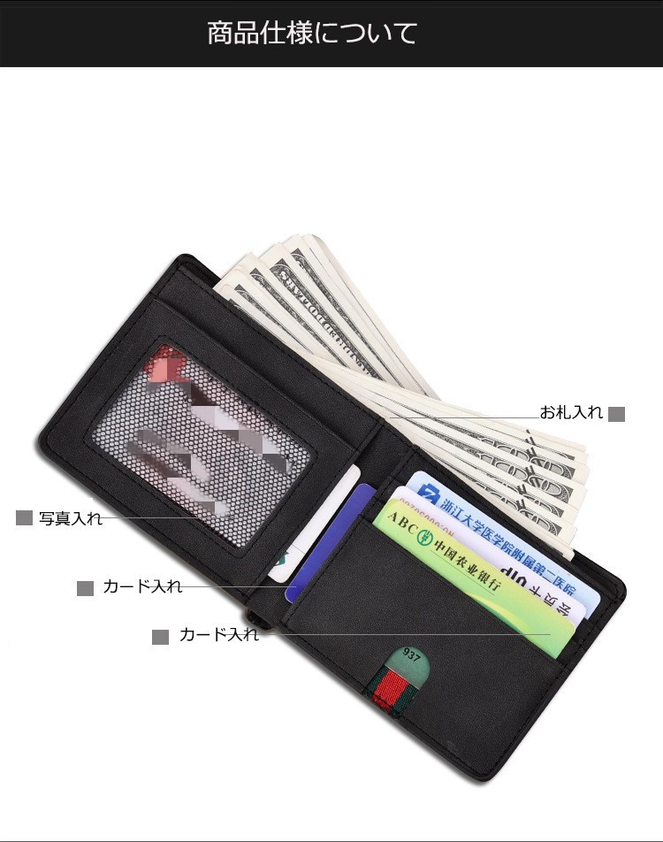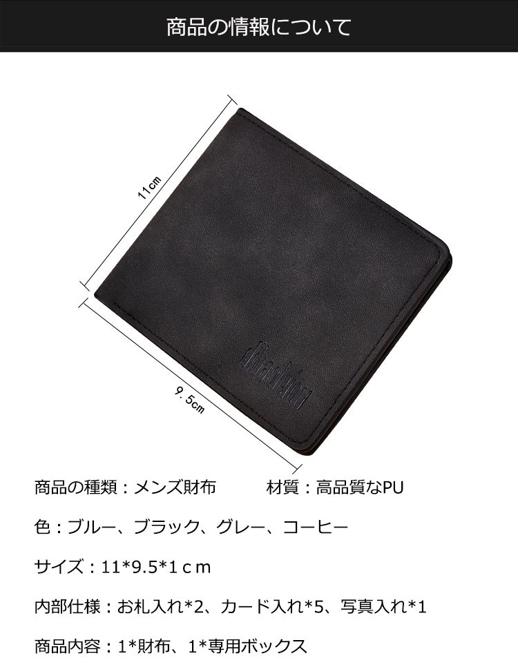 商品の種類:メンズ財布 材質:高品質なPU色:ブルー、ブラック、グレー、コーヒーサイズ:11*9.5*1cm内部仕様:お札入れ*2、カード入れ*5、写真入れ*1商品内容:1*財布、1*専用ボックスボックスのサイズについて:短財布のボックスのサイズ:13*10*3cm長財布ボックスのサイズ:20*10*3cm[商品紹介]紳士用の折りたたみ財布です。カード収納は多いと大容量で、小銭入れも有り、コインも入れます。シンプルかつ、男性的でスタイリッシュなデザイン。高品質なPUを使用しているので、丈夫で長持ちです。綺麗な財布の専用ボックスが付きます。プレゼントに適用です。財布 二つ折り財布 メンズ 二つ折り 薄い 薄型 革 大容量 シンプル カード 20代 30代 40代 50代 革 カード多い おしゃれ レザー 欧米風レザー 牛革 男性 紳士 サイフ 通勤通学 ビジネス ギフト