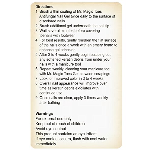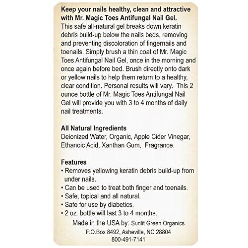 PODIATRIST RECOMMENDED - Mr. Magic Toes is a safe, effective nail fungus treatment which works over time to reduce nail discoloration by breaking down and clearing away keratin debris build up under nails. You should see a change in nail color in 3 - 4 weeks, and notice overall nail improvement in 6 - 12 weeks ( depending on the condition of your nails when starting treatment ). Mr. Magic Toes is organic, vegan friendly and gluten free. No animal testing.