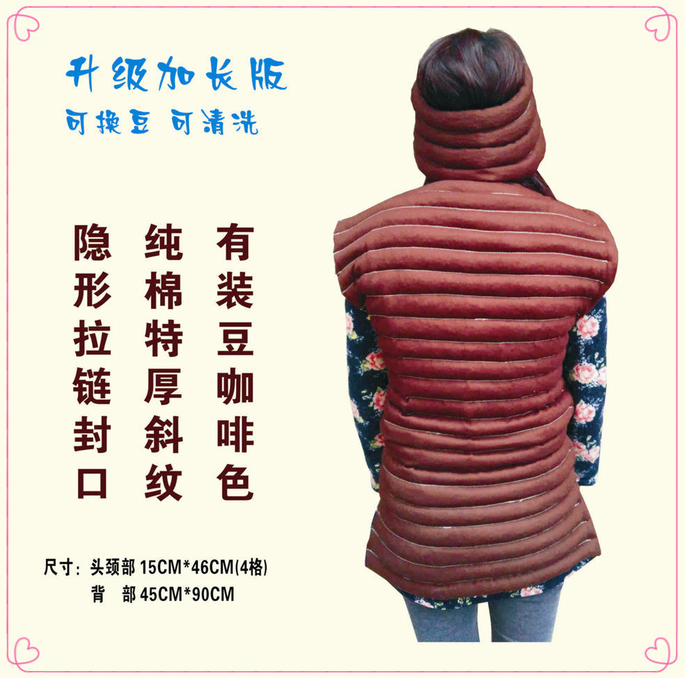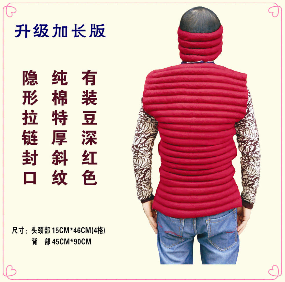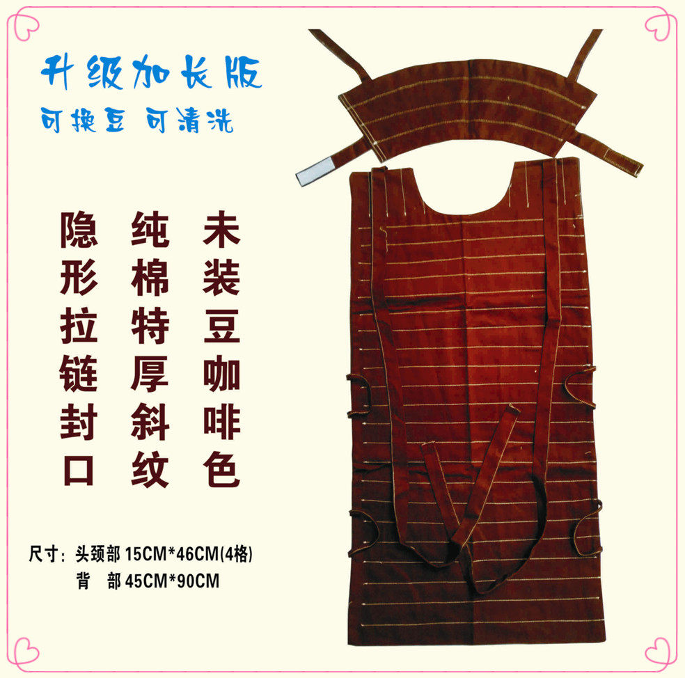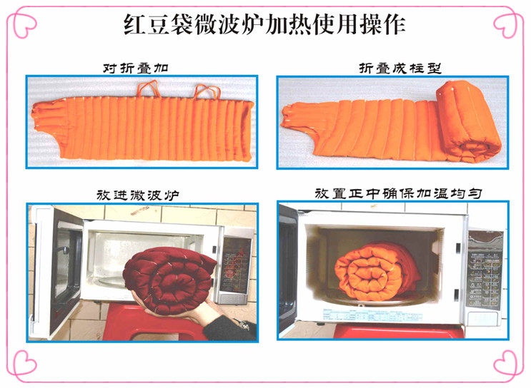 背部红豆袋装红豆5斤半左右不过超过6斤,放在微波炉(中高档)4-5分钟内,头部红豆袋装红豆1斤左右,放在微波炉(中高档)1分钟内。热量适度,热敷于身上即可。或者(中高档)火加热2分钟后,翻个面再加热2分钟(冬天有可能需要加热多1-2分钟的时间,还有根据自己微波炉的功率自己调控一下时间,微调到适合自己温度为止)。注意:1、一定是微波档位的微波炉,用光波会烧坏红豆袋。2、如旧式微波炉内是托盘转盘式的,一定要将红豆袋卷好放入托盘中间,※※启动时必须看到红豆袋在微波炉中顺利转动才可以,如不转动,则要重新放置红豆袋,否则会烧燃红豆袋。加热红豆袋时旁边一定要有人员看护!!!
