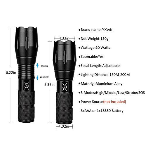 - 【800 LUMEN CREE FLASHLIGHT】 YXwin A100 features a CREE T6 LED offering a powerful 800 lumen beam capable of 350 yards throw and 27500cd peak intensity, which means it will stretch the length of two football fields on a clear night.