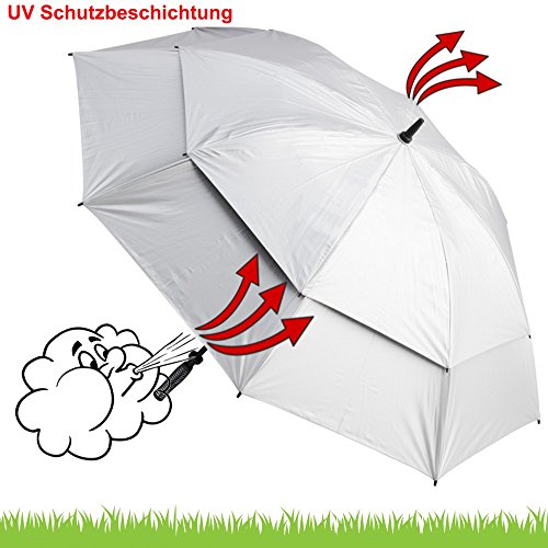 -. Feature : Deluxe-Golfschirm, Modell STORMBUSTER - UV-SCHUTZ - mit Windventil / Farbe: Silber (UV-Schutzbeschichtung) - weitere Farben erhältlich - bitte besuchen Sie unseren Amazon-Shop / Durchmesser 130 cm - selbstverständlich auch als normaler Regenschirm verwendbar / mit Fiberglasschaft und Doppelwindgestänge / incl. Schutzhülle zum praktischen verstauen im Golfbag