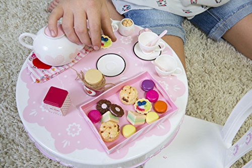 INCLUDES 30 PLAYABLE ACCESSORIES! – 1 teapot with lid, 1 sugar pot with lid and sugar cubes, 1 creamer, 2 tea cups, 2 saucers, 2 small spoons, 1 serving tray, 1 plastic tea tin, 2 paper tea bags, 6 cookies, 2 raisin scones, 2 fruit tarts, 1 jar of jam, 2 mini sandwiches, 2 chocolate cookies, and 1 quilted tea pot cover/cozy.