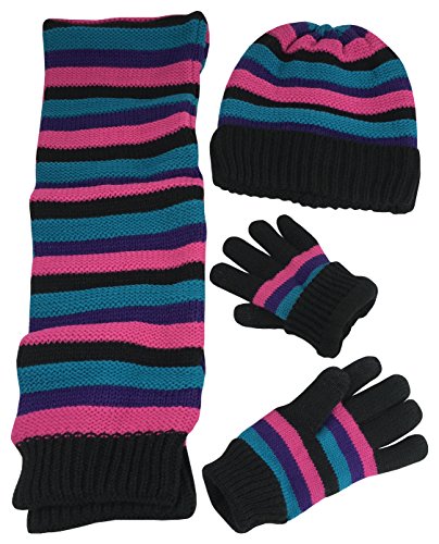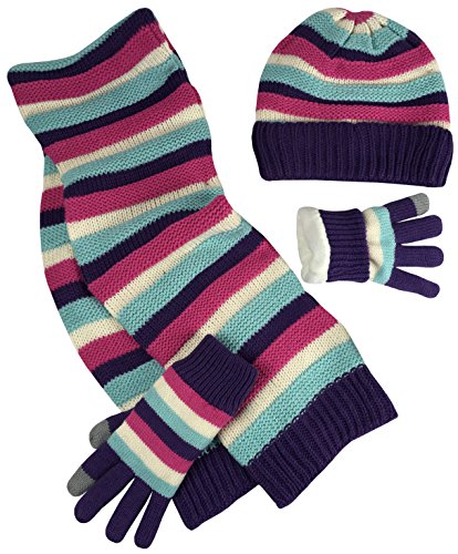 N'Ice Caps Girls Striped Knit Hat Scarf Touchscreen Glove 3PC Sherpa Lined Set