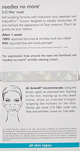 -. Binding : Health and Beauty -. Brand : dr. brandt -. EAN : 0663963007532 -. Feature : Is designed by doctors to visually revalorize, fill and reshape the appearance of face contours. / Comes with a facial brush to apply the product. / You can leave the product on and use daily. -. IsAdultProduct : 0 -. Label : Fab Products -. Manufacturer : Fab Products -. Model : 100000000753 -. MPN : 100000000753 -. NumberOfItems : 1 -. PackageQuantity : 1 -. PartNumber : 100000000753 -. ProductGroup : Beauty -. ProductTypeName : BEAUTY -. PublicationDate : 2016-04-14 -. Publisher : Fab Products -. ReleaseDate : 2016-04-11 -. Studio : Fab Products -. Title : Dr. Brandt Needles No More 3D Filler Mask, 1.7 Ounce -. UPC : 663963007532