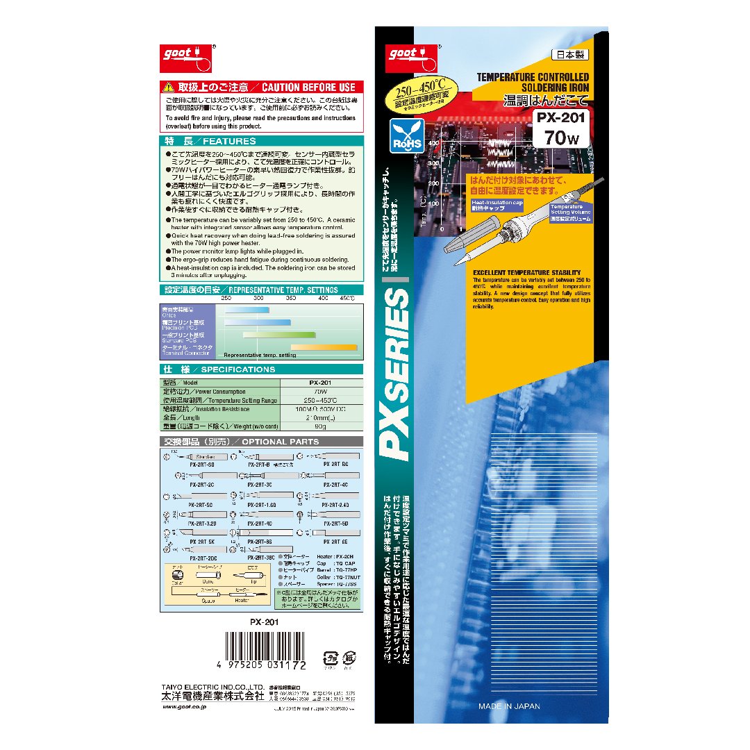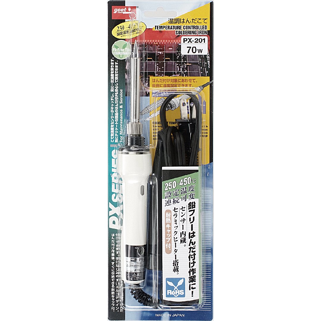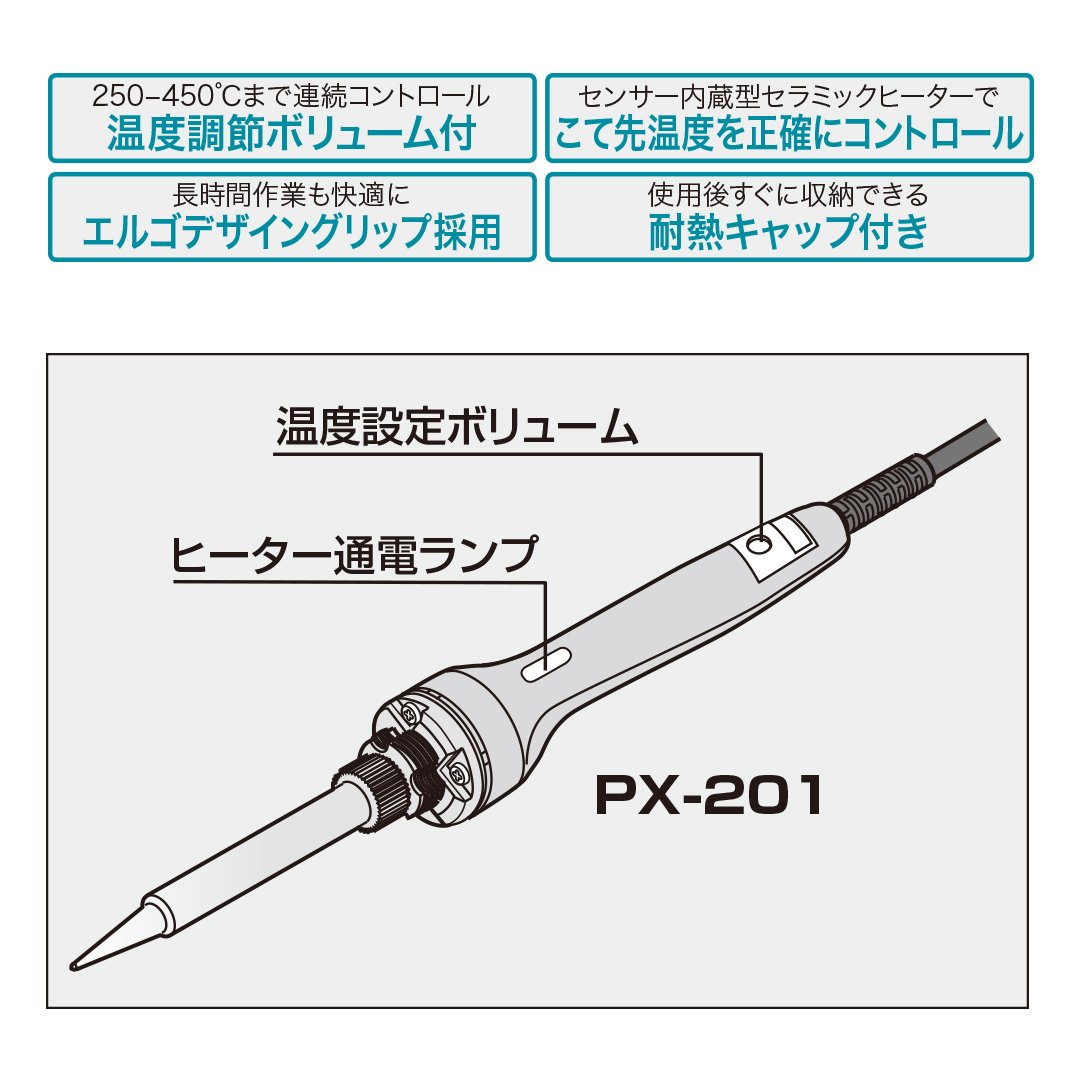 ● Power supply (V): AC100 ● Power consumption (W): 70 ● Included iron tip: PX - 40RT - 5C ● Total length (mm): 215 ● Setting temperature (℃): 300 to 480 ● Solder plating lead free solder