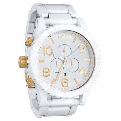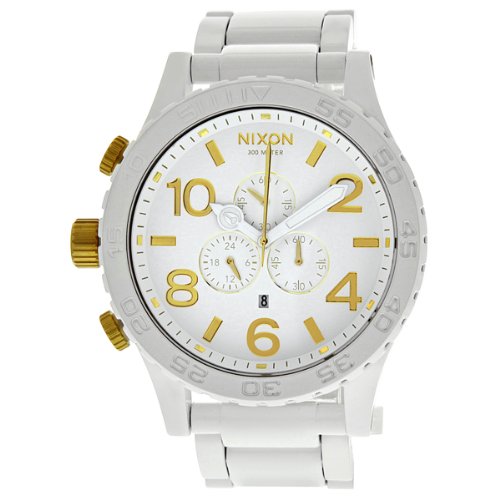Studio : Nixon Publisher : Nixon Binding : Watch Product Description Nixon designed the Men's 51-30 Chrono Watch to withstand serious punishment and all your aquatic adventures. This watch boasts a 300-meter waterproof rating for ultimate precision under pressure. It also has a one tenth of a second subdial chrono. Nixon gave the 51-30 Chrono Watch a brushed stainless steel band and double locking clasp for durable good looks. The 51-30 has a 6 hand Japanese quartz movement and the case is a custom 300 meter stainless steel with hardened mineral crystal, external rotating bezel with a countdown timer and 9:00 o'clock crown position.