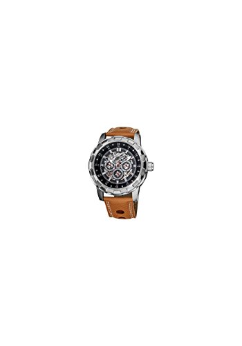 -. Feature : Skeleton dial surrounded by a black outer dial with silver-tone hour markers and a black outer ring / Multifunction features include day, month, and GMT (24 hour) sub dials / Brown, genuine leather, strap with white stitching / Automatic movement, no need for batteries / Water resistant to 165 feet (50 M): suitable for swimming and showering