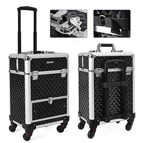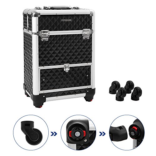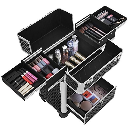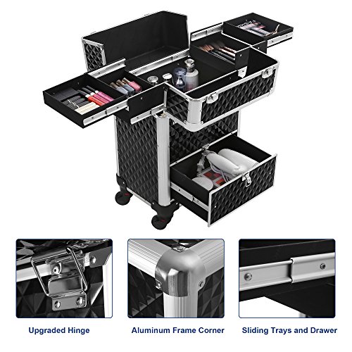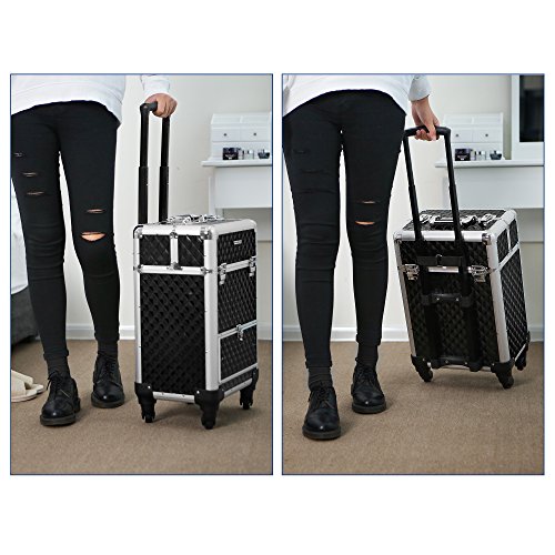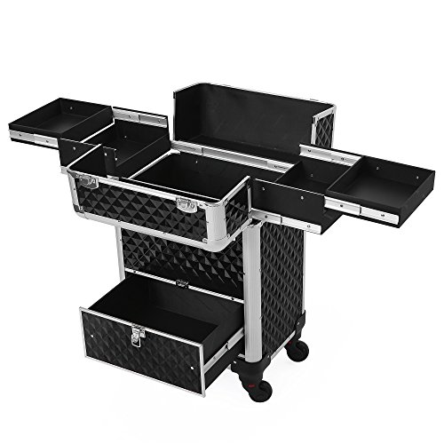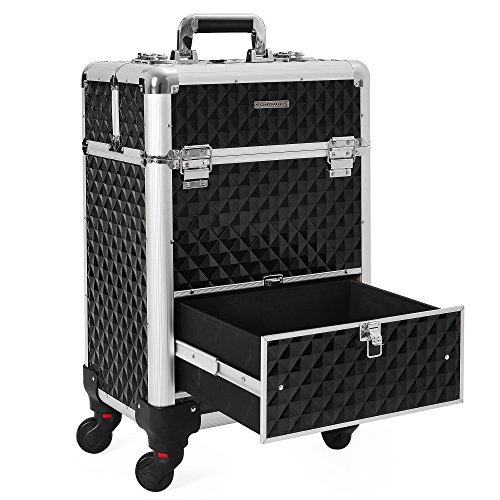 Studio : Songmics Publisher : Songmics Binding : Misc. Product Description With 4 sliding trays, a large compartment and a bottom sliding drawer, this makeup case from SONGMICS is designed to fit all your makeup in a tidy and well-organized manner. Perfect for holding nail polish, foundation, eye shadow singles, or any other accessories you might have. With the 360-degree rolling design and a 4-wheel moving system, which is protected by the secure studs on the bottom from impacts, this professional makeup organizer helps you take all of your cosmetics with you wherever you are needed. Specifications: - Color: Black Rolling Train Case - Material: Aluminium Frame, ABS Surface, MDF Inner Frame - Overall Size: 13 3/8"L x 9 1/2"W x 22 1/8"H (34 x 24 x 56cm) - Single Tray Size: 5 3/8"L x 6 3/4"W x 1 3/8"H (13.6 x 17 x 3.5cm) - Middle Compartment Size: 11 5/8"L x 7 7/8"W x 6 7/8"H (29.5 x 20 x 17.5cm) - Bottom Drawer Size: 10 5/8"L x 8 5/8"W x 4 1/8"H (27 x 22 x 10.5cm) - Weight: 14.37lbs (6.52kg)