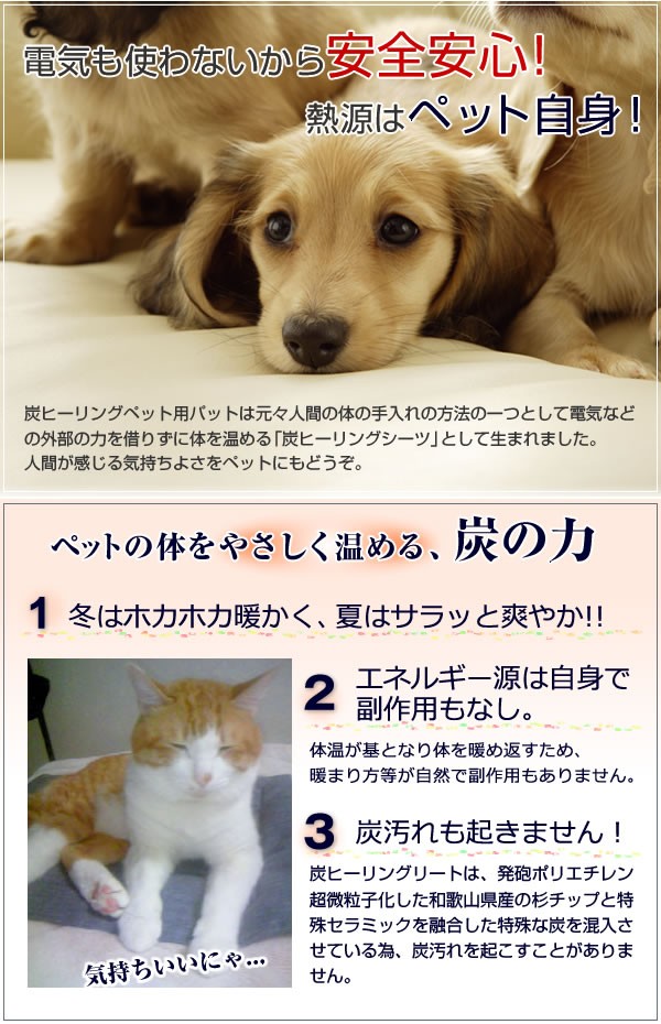 冬はホカホカ、夏はサラッと爽やか。ペットだって気持ちいいほうがいい!炭ヒーリングを使用した、ペット用パットです。ペット自身の力で暖めるから、安全!炭汚れもなく安心なペット用のパットで、あなたのペットをリラックスさせてあげましょう!