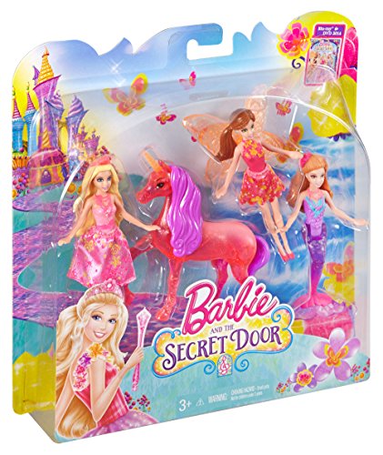 In the all new DVD Barbie and The Secret Door, Princess Alexa finds herself in a magical world filled with brilliant color and fantastical characters. Girls can recreate favorite moments with this gift pack that features four characters to offer full storytelling play right out of the box! Relive the movie from "once upon a time" to "happily ever after" with the princess mini-doll, fairy mini-doll, mermaid mini-doll and a magical unicorn figure. Each wears a signature outfit fans of the film will recognize. Princess mini-doll looks princess perfect in her tea party dress with sparkly bodice and removable flower print skirt. The fairy mini-doll enchants with molded butterflies on her halter neckline, a scallop hem on her skirt and gorgeous translucent orange fairy wings. The mermaid mini-doll is sea-sational with her graphic bodice, ombre tail and shell-inspired hairpiece - use her tail to stand her up on her own! The unicorn also stands alone and positively charms with a glittery pink body, purple mane and tail and yellow horn. This magical foursome will delight fans of the film - and fairytales in general! Plus, the mermaid mini-doll and the unicorn figure can stand unaided; the princess and fairy mini-dolls cannot stand alone. Includes four figures in small doll scale. Collect the Portable Playset to expand the storytelling possibilities and fairytale fun! Ages 3 and older.Feature