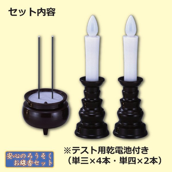 【商品名】 安心のろうそく・お線香セット(電池式LEDライトろうそく・お線香セット) 日本製 (仏事用具) 【ジャンル・特徴】 炎部分をポンと押して点灯、消灯!火を使わずお参りできるセット 火事で見過ごしがちな、仏壇でのロウソクや線香の「火」。「ついうっかり」では済まされない・・・火事にでもなれば大変なことです。本品は、火を使わずお参りできる「安全安心」のセットです。マッチ、ライター、配線も不要の電池式で、ろうそくは炎部分をポンと押すだけで、線香は香炉の灰入れ部前側にあるプッシュスイッチを軽く押すだけで点灯・消灯します。高輝度LEDを採用しているので球切れの心配がなく、明るさ長持ちです。■商品スペック【商品名】安心のろうそく・お線香セット 【サイズ】ろうそく/約直径5×高さ17cmお線香/約直径8.1×16cm 【重量】ろうそく/約38g(電池除く)お線香/約61g(電池除く) 【材質】ろうそく/炎:PE、ろうそく:PP、燭台:ABS、光源:黄色LED、使用電源:単三形乾電池2本お線香/線香・香炉:ABS、光源:赤色LED、使用電源:単四形乾電池2本 【セット内容】ろうそく×2、お
