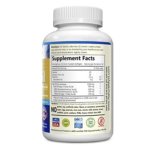 -. and dioxins. We're committed to ensuring that every product meets stringent quality control procedures for purity, potency, and safety. / [Formulated by Doctor with Max Potency and Bioavailability] NatureMyst Omega 3 Fish Oil contains 2500mg Wild Caught Deep Ocean Fish Oil with 950mg Omega-3 Fatty Acids per Serving(2 Enteric Softgels). it's also Enteric coated for better absorption and No burps, fishy odor or aftertaste for better absorption and No burps, fishy odor or aftertaste / [3rd Party Tested for Purity, Potency and Quality for Max Health Benefits] Each batch of NatureMyst Fish Oil is independently third-party tested for Purity, Label Accuracy, Potency .Each softgel is Enteric Coated in a nitrogen vacuum to prevent oil oxidation and preserve the highest quality.Certificated Sustainable by Friend of Sea. Triple-strength Concentration for benefits for Heart, Joints, Mood, Brain, Skin, and Healthy / [60 DAY MONEY BACK GUARANTEE] - As with all of our products, NatureMyst offers a 60 DAY 100% Money Back Guarantee - return even the empty bottles! We are so confident that you will feel and love the natural benefits of NatureMyst Fish Oil, that we'll refund every penny if you aren't 100% satisfied. Simply contact us directly for a full refund. 100% Risk Free Purchase.