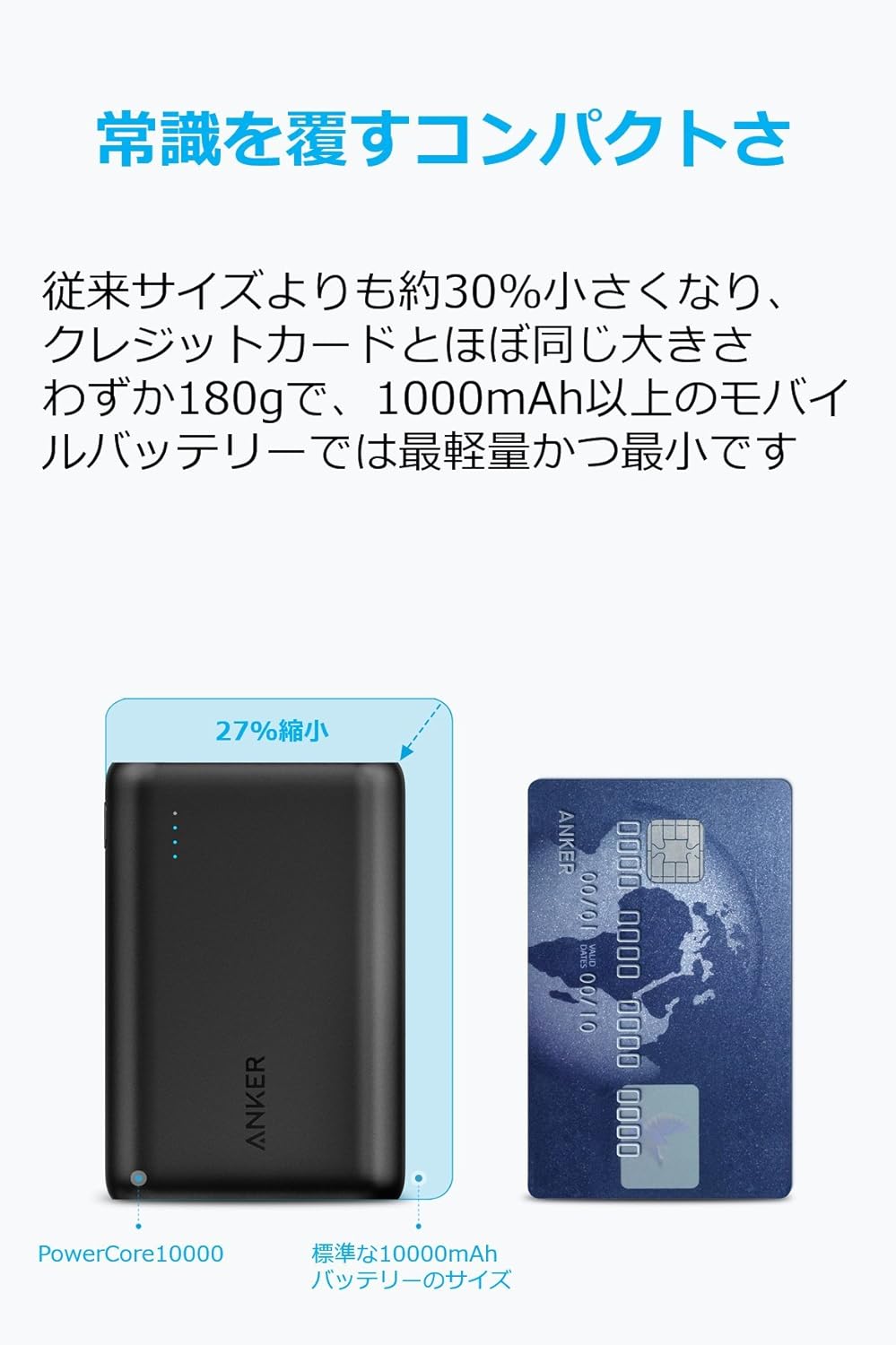 【※ご注意:Anker製品はAnkerDirectのみが正規販売店ですのでご注意ください】世界最小&最軽量:10000mAh以上のモバイルバッテリーでは、世界最小&最軽量(※2017年9月末時点)。10000mAhの大容量ながら、ポケットにも収まるほどコンパクトで、卵3つ分ほどの重さしかありません(約180g)。