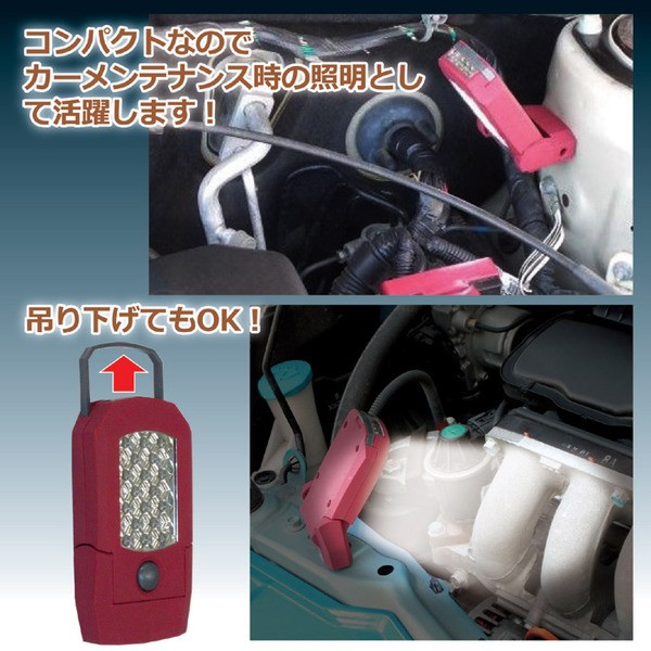 こんなライトが欲しかった!LEDが22球も配置されたコンパクトタイプのLEDライト。4LED照射と18LED照射の2通りの照射が可能で、用途に合わせてご使用いただけます。吊り下げ用フックと脚部に固定用強力磁石が付いて、どこでもカンタンに設置。吊り下げフックも付いてます。脚部が左右180度に曲げられます。今まで暗くて不便だった場所を明るく照らせます。リチウムイオン電池を内蔵し、充電して使用ができます。約5時間の連続点灯が可能。