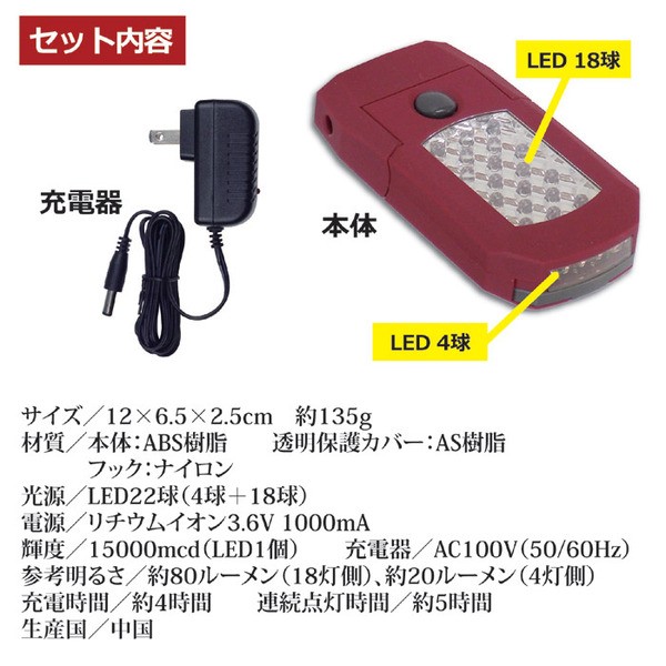 光源:LED22球(4球+18球) 電源:リチウムイオン3.6V 1000mA 充電器:AC100V(50/60Hz)
