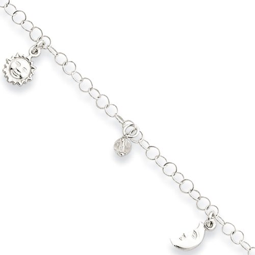 Beautify your ankles with a trendy, dangling anklet made of shimmering sterling silver. It features a 4mm open cable chain finished with a fancy lobster clasp, a 4mm crystal bead plus an animated moon and sun charms. It is also adjustable in length from 9 to 10 inches.Feature