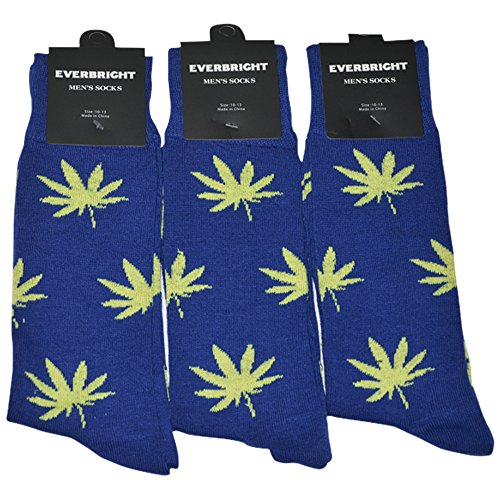 MENS MARIJUANA POT LEAF WEED SOCKS, 3 PAIRS (BLUE WITH YELLOW LEAF)