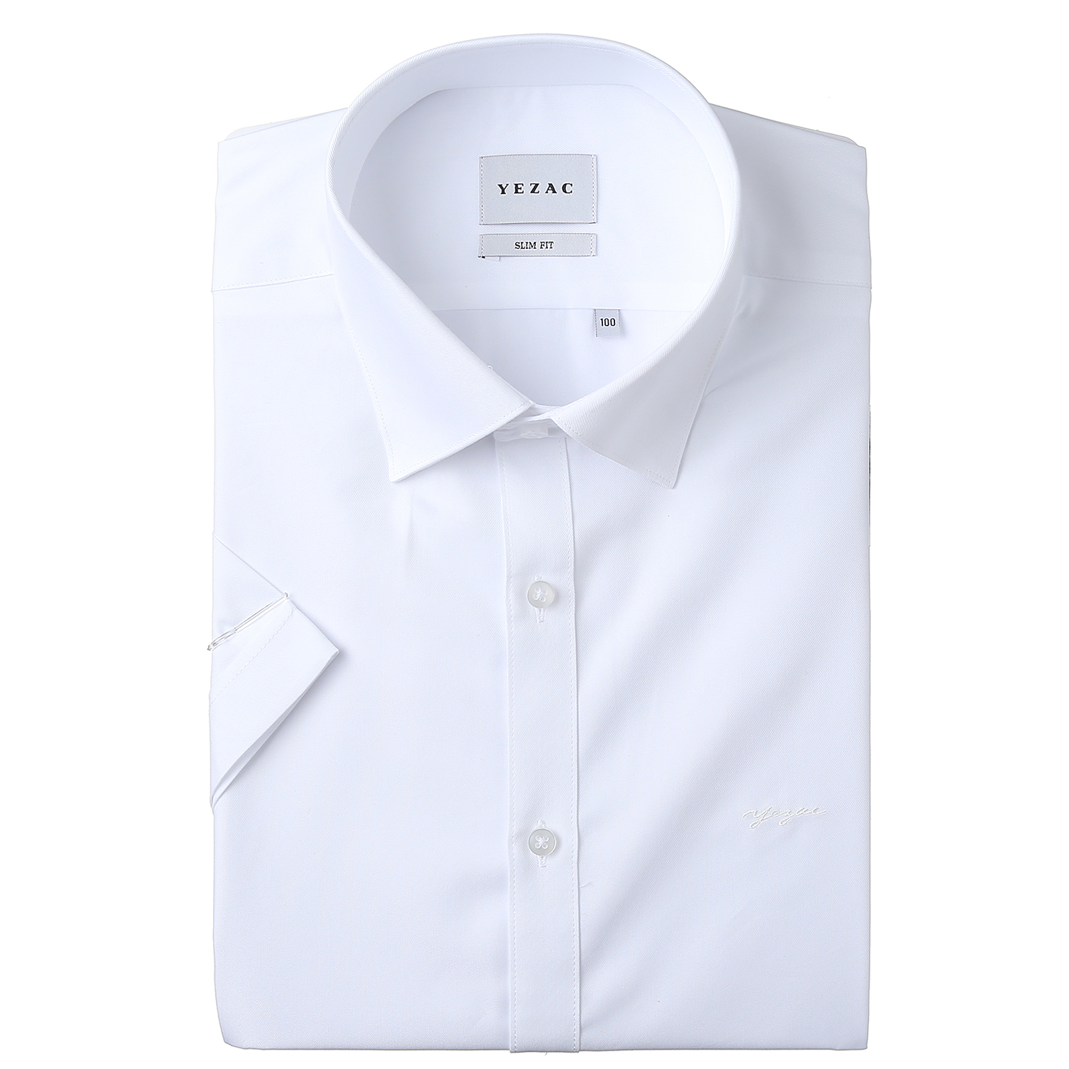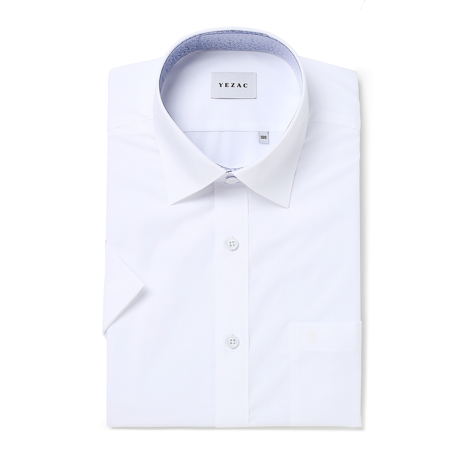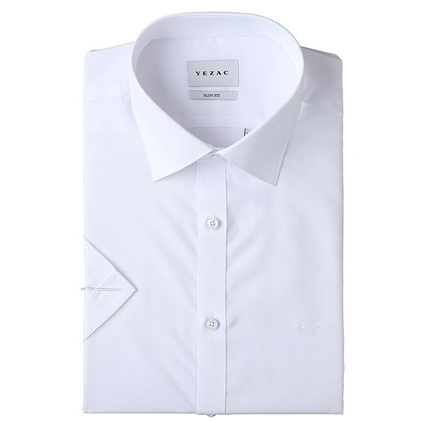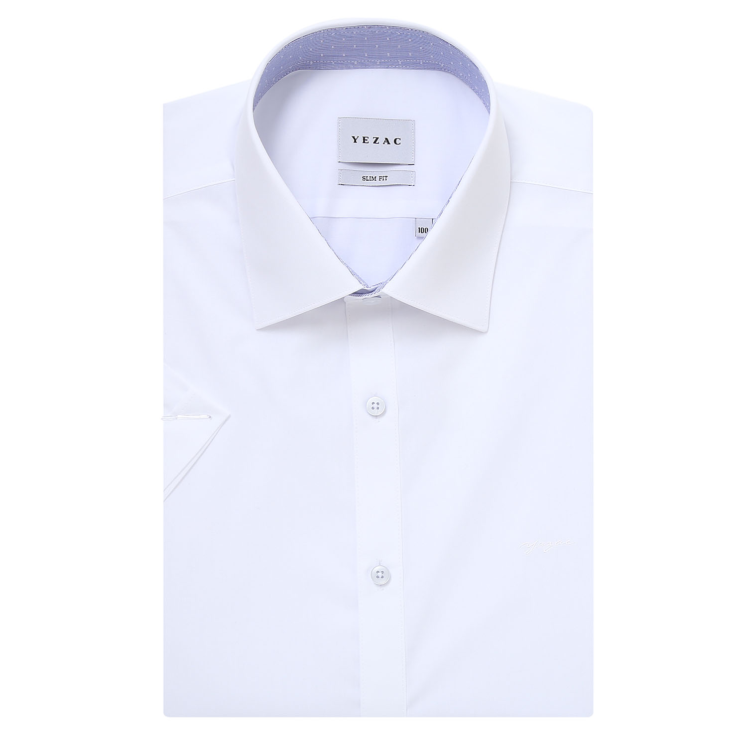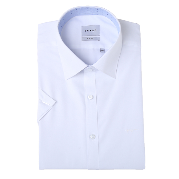 평직 솔리드 화이트 슬림핏 반팔셔츠( 카라 스냅단추 )