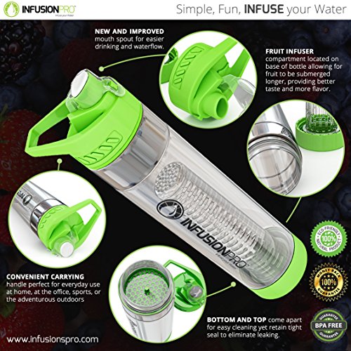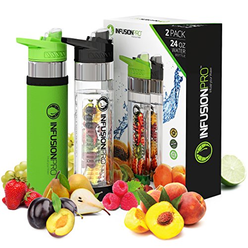 -. Feature : WHATS NEW: SWEAT PROOF - Keep your water cool and eliminate "bottle sweat" with handy neoprene insulated sleeves. Inclusive Inner Strainer/ Filter - Keep your fruit / Ice in your bottle without clogging your drinking spout. / CUTTING EDGE DESIGN: 24 oz Capacity (700ml) 2 PACK includes GREEN and BLACK bottles. The dual openings on the base and top of the infused bottle make it easy to clean the fruit bottle in seconds. The bottle is top shelf dishwashing safe. BPA FREE - Eastman Tritan plastic is environmentally friendly, durable, and attractive. / BOTTOM INFUSER TECHNOLOGY: The fruit infuser compartment is uniquely placed on the bottom of the bottle ensuring the fruit to be submerged longer than many fruit infuser bottles resulting in deep, long lasting tastes even when the hydration bottle is half full. The infuser is REMOVABLE allowing the bottle to act as a sports bottle if desired. / LEAK PROOF & HIGHLY VERSATILE: Both top and bottom screw on lids have rubber gaskets (rings) to prevent any leakage. The stainless steel ring and carrying handle make it perfect for your home, kitchen, outdoor and sports activities, and work. It can be used as a tennis water bottle, smoothie bottle, camping bottle. It is also great for cycling, running, and hiking. / LIFETIME GUARANTEE: We are a family owned business and customer service is our top P.R.Iority. Each bottle has passed comprehensive quality control. If you are not absolutely satisfied and thrilled with your Infusion Pro Water Bottle simply contact us and we will refund or replace it for you.