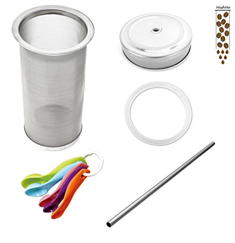 - •COMPLETE COLD BREW COFFEE/TEA MAKER KIT - This super cool kit includes: One 150 micron stainless steel mason jar filter that fits all wide mouth mason jars, One stainless straw, Set of 5 pcs spoons, One stainless steel mason jar lid and One BPA free silicone seal