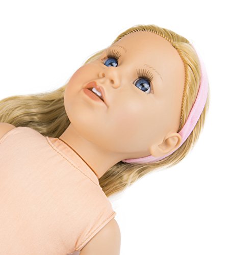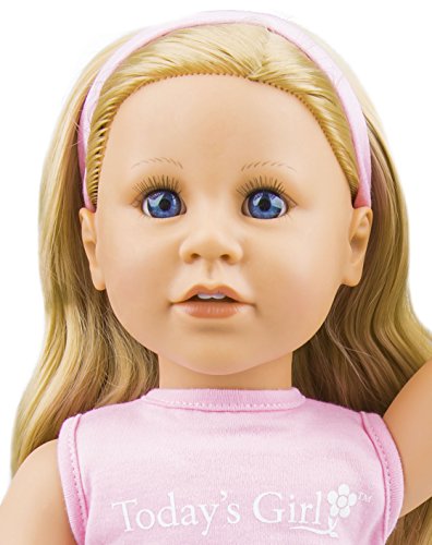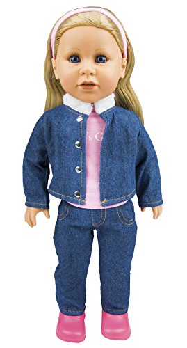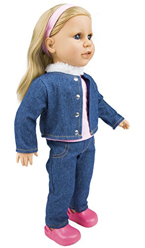 From Today's Girl, CP Toys' line of quality doll products at affordable prices, our gorgeous 18" Emma doll (#LOT-72L) is sure to delight a little girl in your life while encouraging self-expression and individuality. Emma features a soft huggable body and movable vinyl arms and legs. She has long, silky Blonde hair that falls over her shoulders in soft waves, and her big, bright blue eyes feature lovely long eyelashes. Emma comes in an adorable, trendsetting outfit. She sports dark washed skinny jeans with a matching denim jacket trimmed in white fur. Underneath her jacket, she is wearing a light pink Today's Girl graphic tee, which perfectly matches her included headband. Pink slip-on clogs complete the look. Both the Emma doll and her included outfit are compatible with all other 18" dolls, clothing, and accessories. Mix and match her look with other Today's Girl products, as well as American Girl, Our Generation, and more. Package includes (1) 18" Emma doll, (1) pair of pants, (1) tee shirt, (1) jacket, (1) headband, and (1) pair of shoes. Recommended for ages 4 and up.Feature