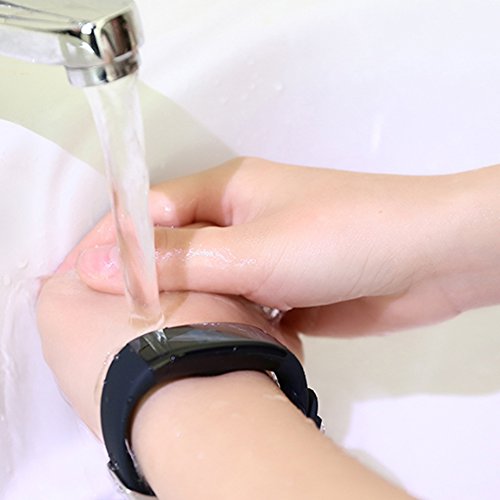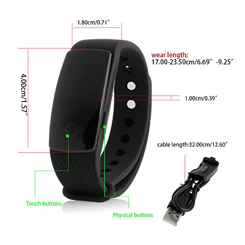 -. Feature : This Smart Bracelet can diaplay the time, steps, sleep icon, music icon and camera icon clearly. More convinient to operate! / When bluetooth paired, you can sync your data to Andriod Phone and iphone. It gives you real-time assessment of your exercise throughout the day. / IP67 waterproof means that steeping depth don't exceed one meter and steeping time don't exceed 30 minutes. / When you have calls or SMS, the smart bracelet will vibrate to remind you. (for iphone, only call reminder, no sms reminder) / Anti-lost function confirms the relative distance between the cellphone and the smart bracelet, if the separation distance esceeds the safe distance, the alarm system will activate.