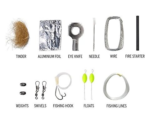 - WITH SHARP EYE KNIFE--The carabiner "grenade" survival kit pull with needle, wire, aluminum foil, tinder, fire starter, fishing lines, fishing hooks, weights, swivels, dobber wrapped in 500 lb (227 kg) paracord