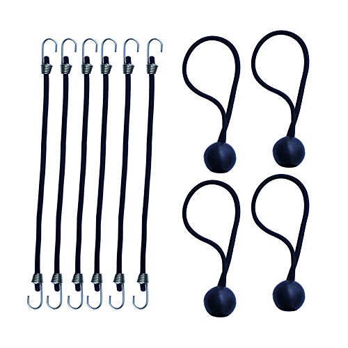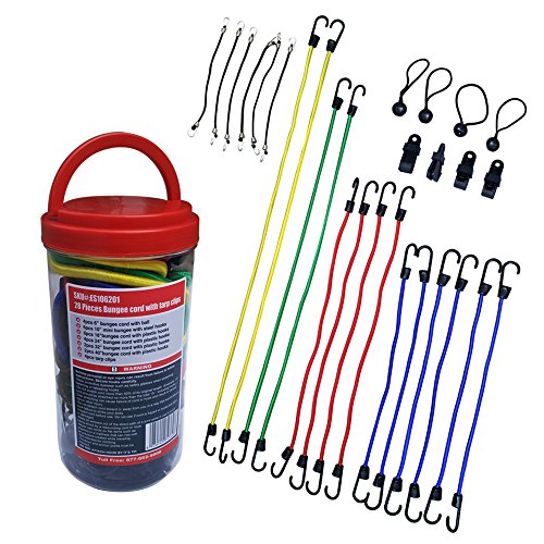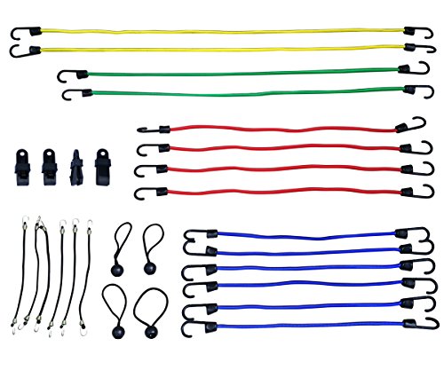 28 Pcs of bungee coard kit including (6pcs) 18", (4pcs) 24", (2pcs) 32", (2pcs) 40", (6pcs) mini cords , (4pcs) canopy ties and Extra (4pcs) patent Tarp clips, which is designed for secure your invest in the big wind or fasten tightly when driving.
