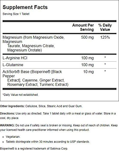 Description:Superior Magnesium Complex with Amino Acids for additional support. Magnesium participates in numerous enzymatic reactions in the body and is needed for proper heart, muscle and nerve function as well as a healthy blood system. Magnesium Taurate is intended to enhance normal, healthy neurotransmitter function and brain circulation. Magnesium together with Calcium also supports healthy bones and teeth. KAL's exclusive ActiSorb Base enhances mineral absorption by stimulating gastric secretion and the body's thermogenic activity. Size: 60ct Directions:As a dietary supplement, take 1 tablet daily with a meal or a glass of water.Serving Size: 1 Tablet 60 Servings per container Ingredients:Amount per serving:% Daily Value: + ActiSorb BaseBioperineBlack Pepper Extract, ginger Root Extract, Rosemary Leaf Extract, Turmeric Root Extract and Cayenne Extract10 mgL- Glutamine100 mgL- Arginine HCl100 mgMagnesium (as Magnesium OxideMagnesium Taurate, Magnesium CitrateMagnesium Orotate)500 mg125%Key to Ingredients:
