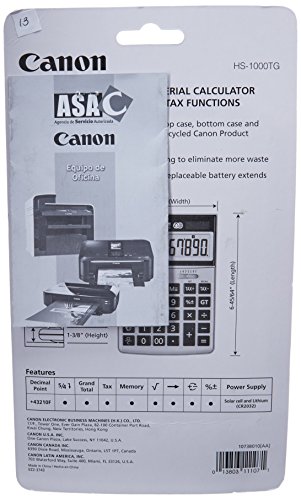 10-Digit desktop calculator is made from the recycled materials of Canon copiers with the upper and lower casings being made with a high percentage of recycled material. Functions include tax calculation, square root, sign change, three-key memory, multiplication, division, percentage calculations and grand total. Decimal positions include a, 4, 3, 2, 0, and F. The large LCD screen easily shows all your computations. Desktop calculator runs on solar and battery power and shuts off automatically after approximately seven minutes.Feature