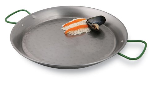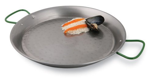 This Paderno World Cuisine 18.5 inch polished carbon steel paella pan, with it's depth and flared sides makes it easy to cook paella, as the shape encourages the quick evaporation of liquid. The pan is constructed of black steel with dual handles.
