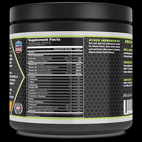 Offered in a delicious Orange flavor, this muscle building supplements contain 3,000 mg of L-leucine, 1,000 mg of L-isoleucine and 2,000 mg of L-valine in every serving of 7.1 grams – Our supplement comes in a 0.48 lbs. providing Approx. 20 servings per container.