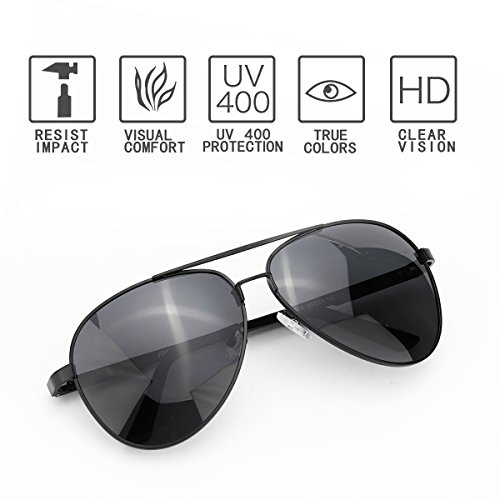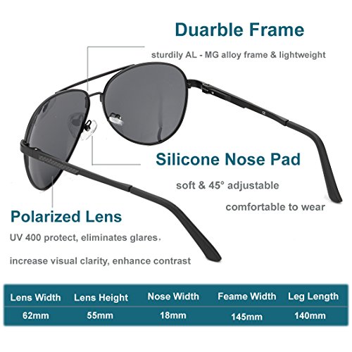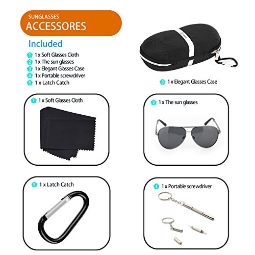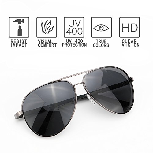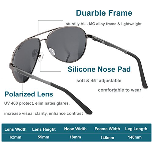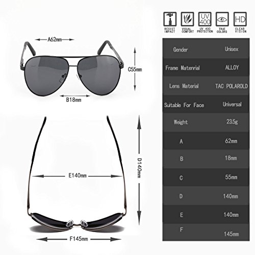 -. Feature : STYLISH WARDROBE ESSENTIALS: This aviator polarized sunglasses add a modern touch to a time-honored classic. It's suitable for different occasions to wear, is your daily wear with the essential choice. / TAC POLARIZED LENS: TAC lens includes 7 layers, maximum UV 400 protection, blocks harmful UVA & UVB Rays effectively. Restore the true colors that keep you away from the glare when you driving. Perfect choice for outdoor sports and activities such as cycling, driving, shopping, travelling, hiking, and is suitable as high fashion accessory and daily wear all year round. / STRONG & LIGHTWEIGHT: Aluminum megnesium alloy make frame Strong and light, combined with great craftsmanship improves the durability of this classic aviator sunglasses frame. Lightweight sunglasses provide you with a more comfortable wearing experience. The weight of the sunglasses (27g/0.9oz) is about equal to three one-dollar coins. / FLEXIBLE & DURABLE: Flex hinges with a small spring offer a 30 degrees flexible zone for movement to provides the ultimate in performance and comfort, impact, scratch resistant and durable. And fit your head shapes, could be ideal mens sunglasses and women sunglasses. / 100% MONEY BACK GUARANTEE: We are promise OUR SUNGLASSES HAVE 12 MONTHS GUARANTEE, besides, We are committed to providing our customers total satisfaction. If for any reason you are not satisfied with your purchase, please don't hesitate to contact us and let us know. :)