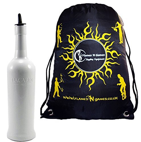 -. Feature : Flairco "Bacardi" Bar Flair Bottle with stopper and handy travel bag. / Made from shatterproof plastic, ideal for practising all types of tricks and stunts! / Ideal for amateur and professionals who practise and want to improve their flair skills. / Dimensions: Height: 300mm, Diameter: 80mm, Volume: 750ml, Weight: 406g / *Check out our Flames 'N Games Store for loads more cool items!!