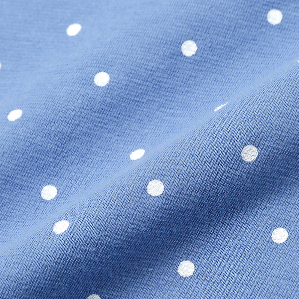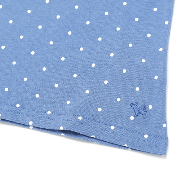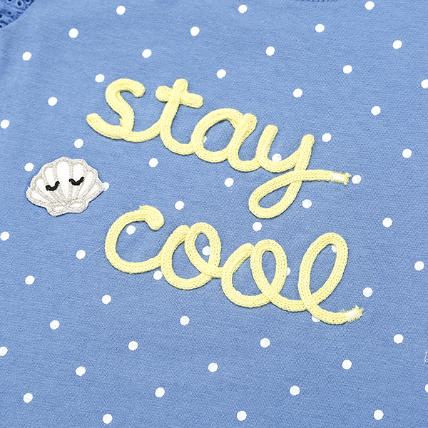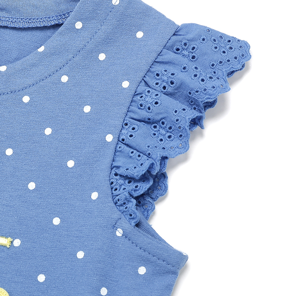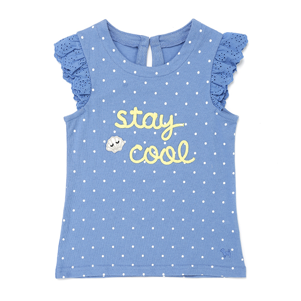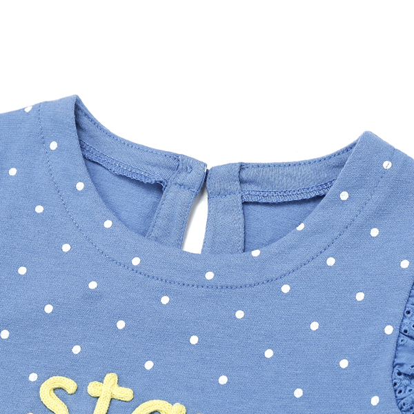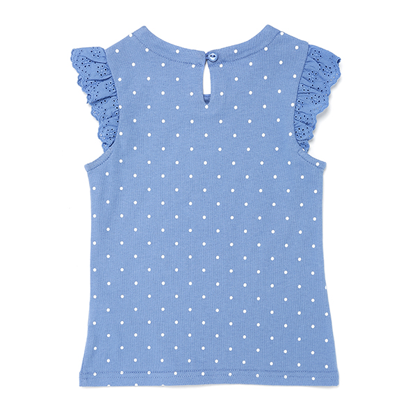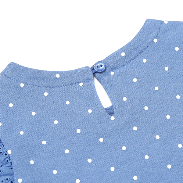 도트 전판 소매에 아일렛 매치가 된 여아 티셔츠입니다.