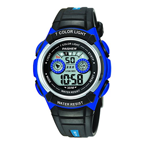 This waterproof watch with digital display has a durable PU band, stainless steel back and EL backlight for the night. It is lightweight and very comfortable to wear.