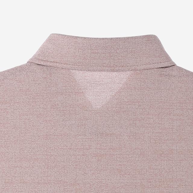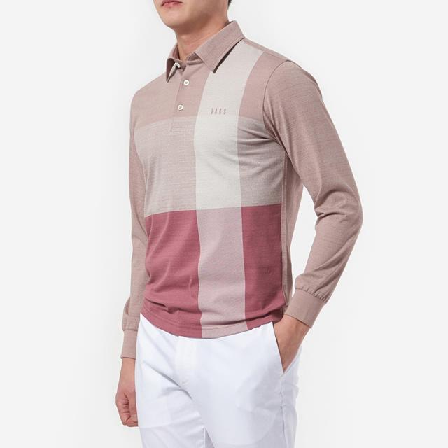 투톤의 멜란지 컬러감을 사용하였으며 전체적인 체크 패턴으로 세련된 외관을 보여주는 카라 티셔츠입니다.