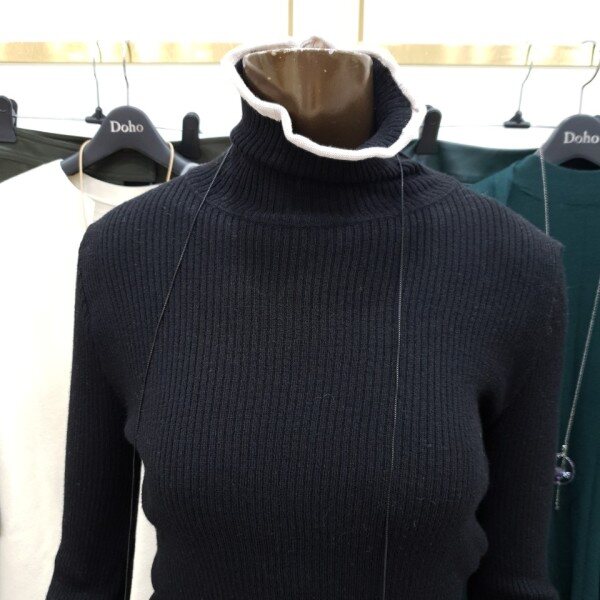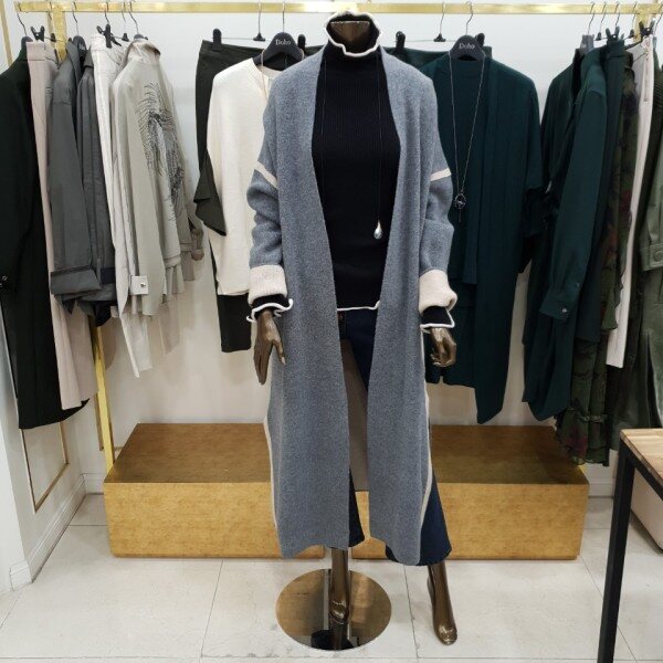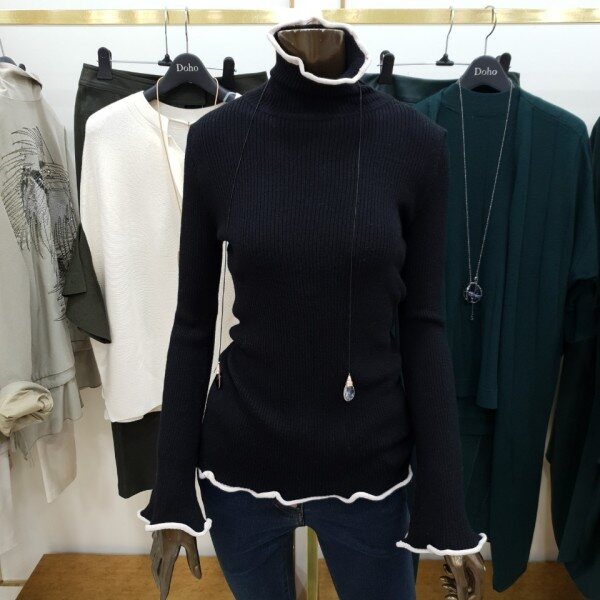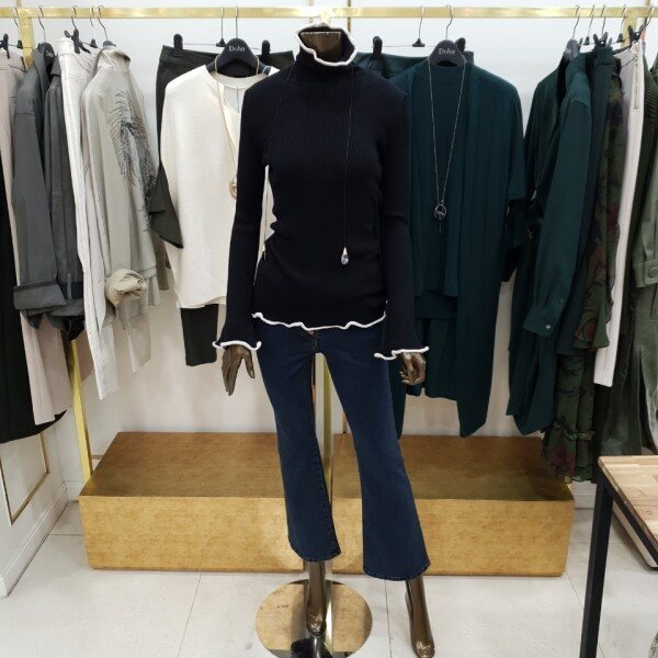 물결 모양 곡선 실루엣 디테일이 특징인 니트 입니다