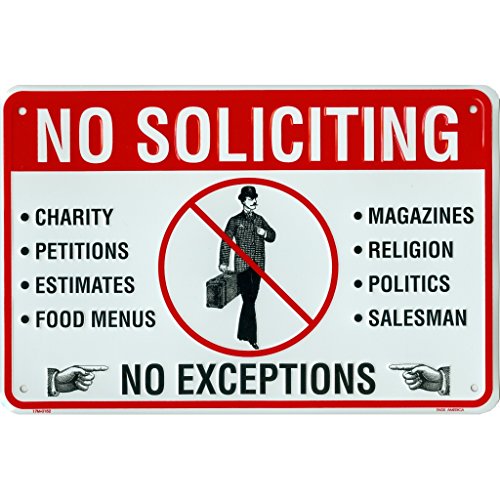- ALARMING: This vibrant black, white and red No Soliciting Sign with classic solicitor, is sure to deter any unwanted entries to your business or home. Sends a loud message to salesmen, politicians, charities and others that you refuse to listen to their offer, no exceptions.
