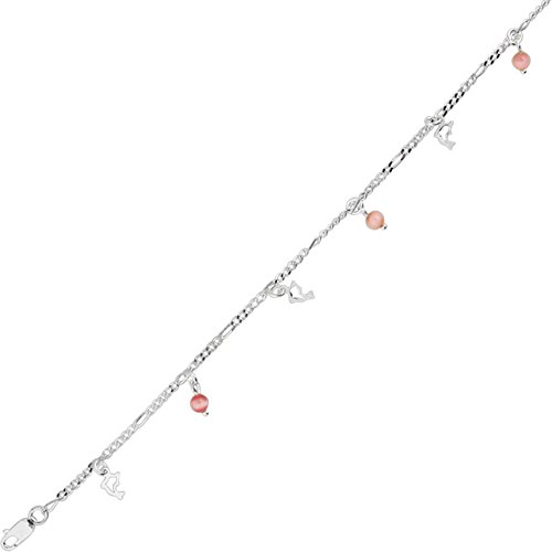 -. Title : 10" Rhodium Plated 925 Sterling Silver Shiny Figaro Type Anklet w/ Lobster Clasp & Dolphin Charm & Pink Ball
