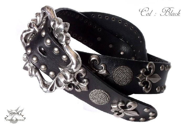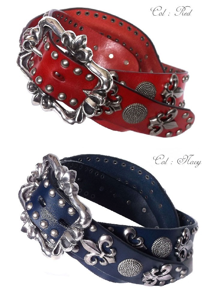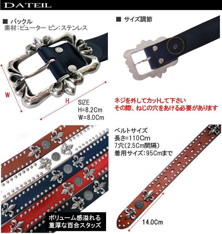 上質の一枚革ベルト、表面にアンティーク風のコーティーング!立体感、重量感のある百合とオーバルデザインのスタッズ。重厚でフラットな形状の百合デザインバックル(合金)【素材】 ベルト:牛革 バックル:ピューター【サイズ】ベルト:長さ110cm 幅3.8cm 厚み:0.5cm 95cmまで着用可能 ※長さ調節可能 【仕様】 ベルト穴5穴(2.5cm間隔) 【カラー】ホワイト・ブラウン・レッド・ネイビー・ブラック