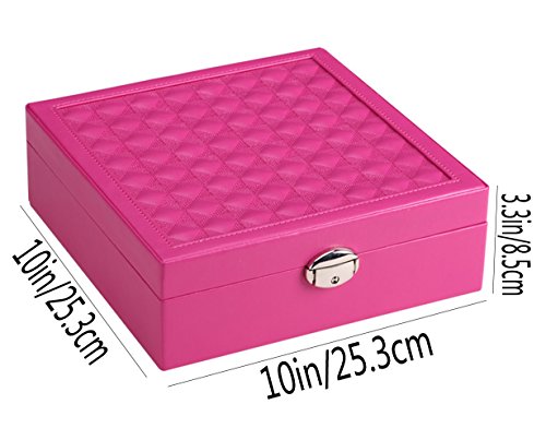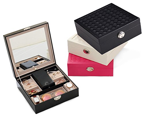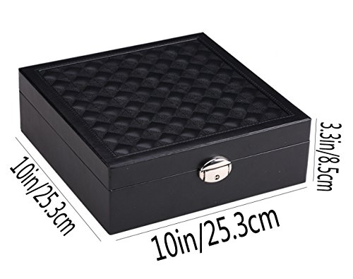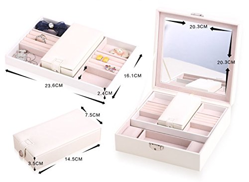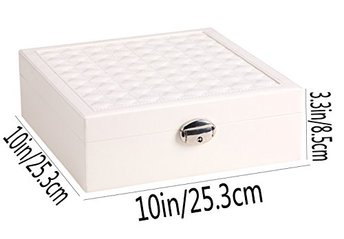 -. Feature : Made of high quality wood internal and soft faux leather exterior, with cushiony velvet interior, on top of the box there are some lovely stitching and they form lovely diamonds pattern on the box, makes this jewelry organizer very pretty. / Measuring 10" x 10" x 3.3", and weight is 1.4 KG, the box has a smaller 5.7" x 3" x 1.4" removable box within it that holds earrings or cufflinks, and can also serve as a handy travel size case for short trips. / A decent size mirror which can be pulled out and which make it easy to see what your jewelry looks like while trying it on, and it can be locked with a provided key. / Two trays. In the first tray for 24 rings, 6 dedicated earring/cufflink compartments in the small removable box, and 2 removable watch holders. The top tray lifts out to reveal the bottom tray which has 6 medium size compartments for necklaces or bracelets plus one large one for bulky necklaces or extra watches. / Closed this box looks like a work of art, a very great Christmas gift for friends or couple.
