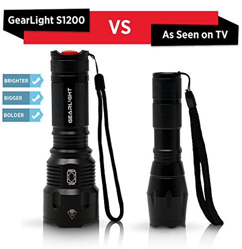 - BIGGER, BRIGHTER, BETTER - Hold the Gearlight in your hand and know you’re holding something substantial. With a solid build and blinding brightness, the S1200 outshines any “As Seen On TV” tactical flashlight. This mid-size flashlight is big on power but compact enough to fit in your backpack, survival bag, or car glove compartment.
